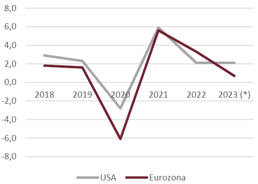 Fig. 2 / Estados Unidos y Eurozona. Crecimiento del Producto Interior Bruto (PIB), precios constantes, tasas anuales de variación, 2018-2023 (previsión)