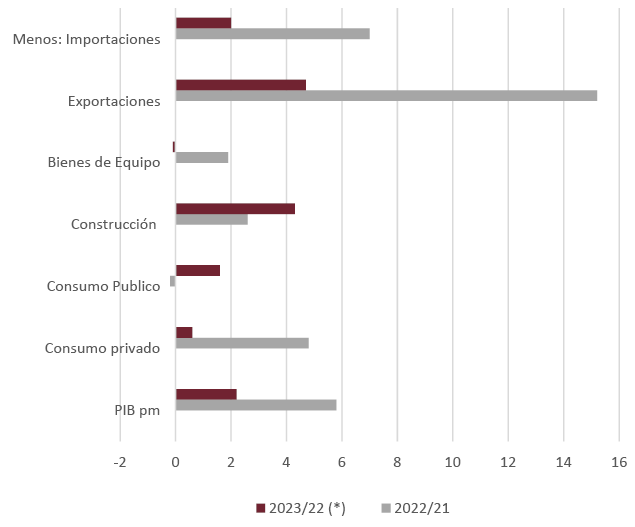 Fig. 3 / Producto Interior Bruto (PIB), componentes, precios constantes. Tasas de variación interanual, 2022-2023 (previsión)