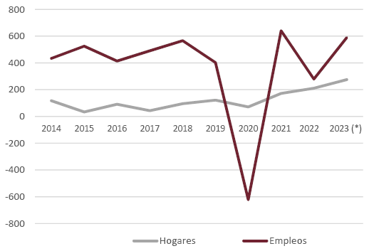 Fig. 4 / Empleo y Hogares (miles). Variaciones anuales netas, 2014-2022. Serie anual, 2014-2023 (previsión)