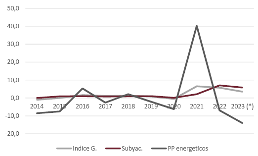 Fig. 5 / Índice de precios de consumo. Índice general, inflación subyacente y Productos energéticos. Tasas interanuales (%), 2014-2023 (previsión)