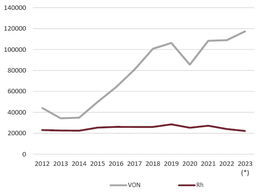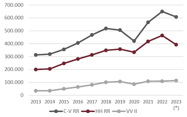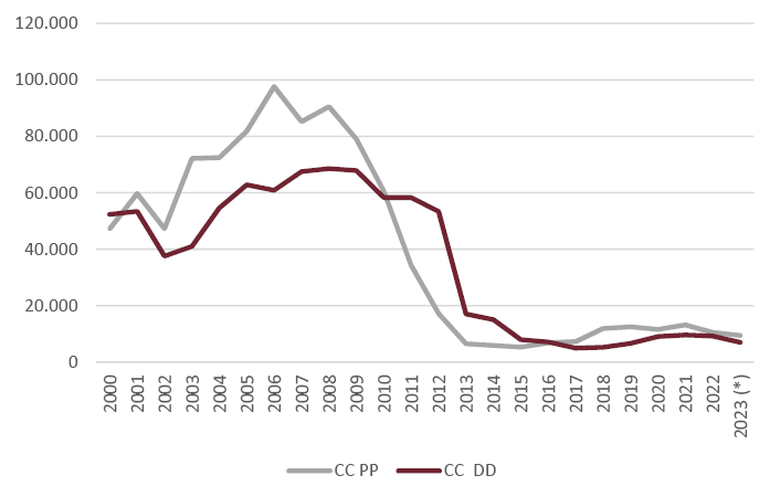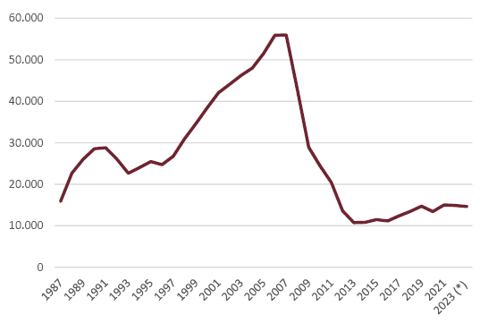 Frente a dicha situación, la construcción de nuevas viviendas protegidas no ha crecido en el primer semestre de 2023, a la vista de la evolución de los datos disponibles sobre la evolución de las calificaciones provisionales y definitivas de viviendas protegidas. En el primer semestre de 2023 las calificaciones provisionales descendieron en un 10% sobre el mismo periodo de 2022, mientras que las calificaciones definitivas retrocedieron en 24,4%, con datos referidos al total de planes de vivienda, que incluyen el Plan de Vivienda 2022-2025 y los planes autonómicos (Fig. 22). Todo indica que los totales anuales de dichas magnitudes estarán en 2023 por debajo de las diez mil viviendas anuales. El gráfico de la Fig. 22 revela que a partir de 2013 se produjo un gran retroceso de las calificaciones provisionales, coincidiendo con la eliminación de la garantía de financiación crediticia de las nuevas viviendas protegidas en el Plan de Viviendas 2013-2016.