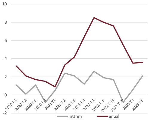 En 2023 ha destacado la pérdida de fuerza de la economía de la Unión Europea, advirtiéndose una acusada desaceleración del crecimiento en el primer semestre de 2023 (European Commision, 2023). La debilidad de la demanda interna fue el principal factor explicativo de dicha evolución, destacando el débil aumento real del consumo, como consecuencia de la persistencia de la fuerza de la inflación. La importante desaceleración del aumento del crédito aportado a la economía confirma el impacto negativo sobre el crecimiento derivado del endurecimiento de la política monetaria. Las previsiones de la Comisión Europea apuntan a una desaceleración de la actividad económica en el segundo semestre de 2023, que sería más acusada en la industria que en los servicios. La industria se ha visto afectada por el encarecimiento de los productos energéticos y por las incertidumbres respecto del suministro de los mismos.