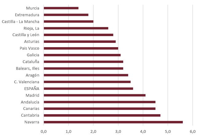 En 2023 ha persistido la desaceleración del índice de precios de viviendas. Frente al aumento del 5,5% registrado en 2022 por dicho indicador, en el segundo trimestre la variación interanual fue el 3,6% (Fig. 7). Dicho aumento interanual fue superior en el caso de las viviendas de nueva construcción, el 7,7%, frente al 2,9% correspondiente a los precios de las viviendas usadas. Los mayores aumentos interanuales fueron los de Navarra (5,6%), Cantabria (4,7%), Andalucía (4,5%) y Canarias (4,5%) (Fig. 8). Destacó el incremento de los precios de las viviendas de nueva construcción en Canarias (14,0%).