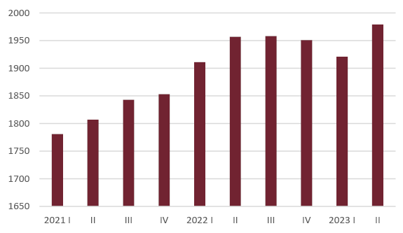 Fig. 9 / España. Precios de las viviendas, euros/m2. Datos trimestrales, 2021-2023