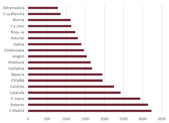 Según la estadística registral inmobiliaria de los Colegios de Registradores de la Propiedad, el nivel medio de precios alcanzado por las viviendas en el segundo trimestre de 2023 fue 1979 euros/m2 (Fig. 9), 2212 euros/m2 en el caso de las viviendas nuevas y 1925 euros/m2 para las viviendas usadas. Los precios más elevados, según dicha fuente estadística, fueron los de la Comunidad de Madrid (3231 euros/m2) y Baleares (3143 euros/m2) (Fig. 10).
