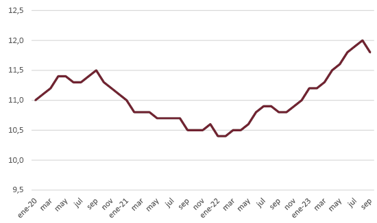En 2023 ha persistido la desaceleración del crecimiento de los precios de consumo, descendiendo la variación interanual desde el 5,7% en diciembre de 2022 hasta el 3,5% en septiembre de 2023. La inflación subyacente (excluye energía y alimentos no elaborados) se desaceleró desde el 7,0% en 2022 hasta el 5,8% en septiembre de 2023 (Fig. 5). Los precios de la energía registraron una variación interanual del –14,0% en septiembre de 2023, aunque dicho componente del índice de Precios de Consumo volvió a registrar aumentos intermensuales importantes en agosto y septiembre de este año.