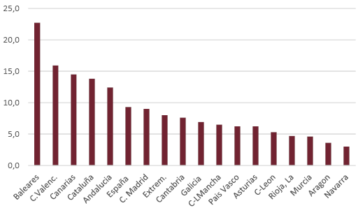 Los alquileres de viviendas, según el portal idealista.com, aceleraron el aumento en 2023 (Fig. 11). La variación interanual de los alquileres de viviendas fue el 9,3% en septiembre de 2023, superior al 7,2% de diciembre de 2022. Las mayores variaciones interanuales en 2023 han sido las de Baleares (22,7%), Comunidad Valenciana (15,9%) y Canarias (14,5%) (Fig. 12). Se advierte en general la presencia de aumentos más intensos de los alquileres en los territorios con mayor peso de la actividad turística. El nivel medio de alquileres fue de 11,8 euros/m2-mes en España en septiembre de 2023. Los niveles de alquileres más elevados fueron los de Baleares (16,2 euros/m2-mes) y Comunidad de Madrid (16,1 euros/m2-mes).