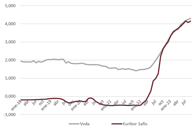 El número de hipotecas registradas sobre vivienda en el periodo de enero-agosto de 2023 disminuyó en un 15,4% respecto de 2022. Dicho descenso fue más acusado, el 24,9% en el caso de los préstamos hipotecarios destinados a compras de viviendas, según el Centro de Información Estadística de los notarios en el mismo periodo de 2023. La Encuesta de Préstamos Bancarios del Banco Central Europeo indica que en la primera mitad de 2023 ha descendido la demanda de financiación por parte de los hogares ante las entidades de crédito y que estas últimas han restringido la oferta de crédito.