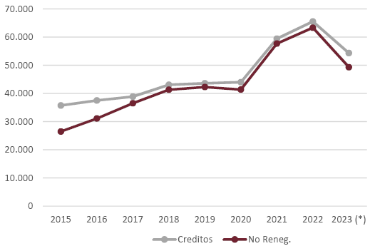 Fig. 14 / Prestamos a comprador de vivienda. Total y operaciones no renegociadas. Totales anuales, 2015-2023 (previsión), millones de euros