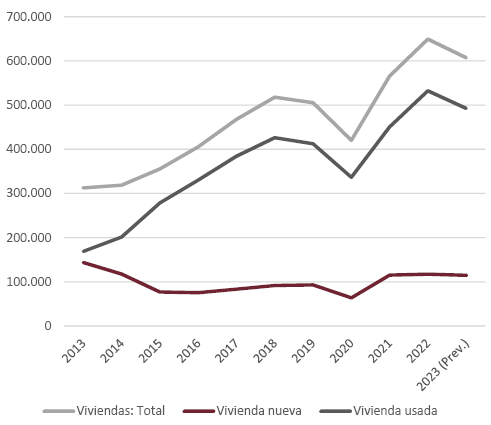 El ritmo de ventas de viviendas en el primer semestre de 2023 se situó por encima de las 600 000 en un año, cifra que, aun siendo inferior a la de 2022, implica un volumen considerable. La caída de las ventas fue menor que el descenso citado del número de préstamos hipotecarios para compra de vivienda, lo que implica que más de la mitad de las ventas de viviendas se han realizado al contado durante el periodo de enero-agosto de 2023, lo que corresponde a compradores de viviendas con fines de inversión y de colocación de ahorro. El que los precios de las viviendas hayan seguido subiendo en 2023, aunque a un ritmo inferior al de 2022, ha contribuido al descenso de las ventas para usuarios ocupantes, mientras que se ha mantenido la demanda en el segmento correspondiente a los inversores. La evolución financiera reciente implica que los tipos de interés reales se van a estabilizar en niveles más elevados que los que han predominado en los años anteriores, lo que sin duda afectará a los niveles de ventas de viviendas (Diez, 2023).