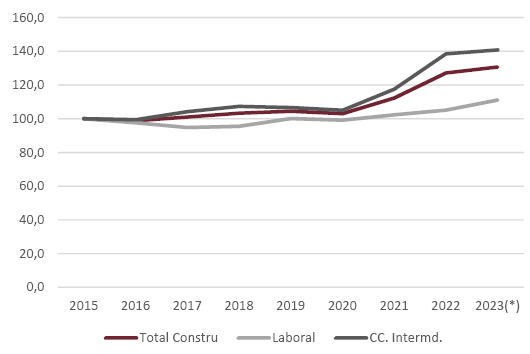 Fig. 20 / Coste de la construcción, 100=enero 2015. Coste total, costes laborales y consumos intermedios (materiales). Datos anuales, 2015-2023 (previsión)