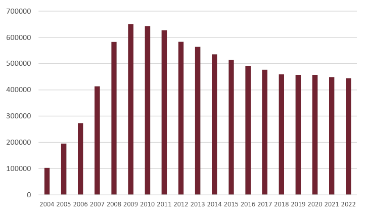 Fig. 21 / Stock de viviendas de nueva construcción no vendidas. Datos a 31 de diciembre, 2004-2022