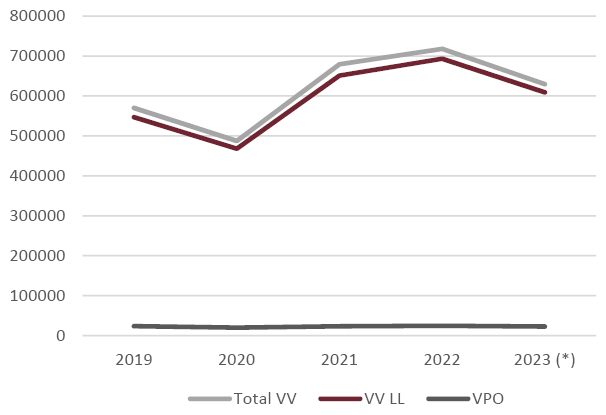 Fig. 23 / Transmisiones inmobiliarias, viviendas. Total, libres y protegidas. Totales anuales, 2019-2023 (previsión)