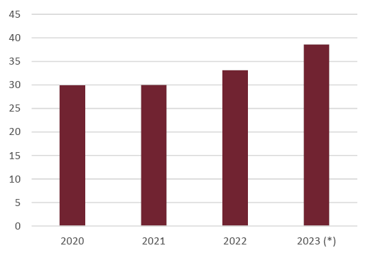 Según las estadísticas del Banco de España, el esfuerzo de acceso a la vivienda en propiedad ha aumentado desde el 29,9% de la renta media disponible por hogar en 2020 hasta el 38,6% en el primer semestre de 2023 (Fig. 24). La estimación citada se refiere al esfuerzo para el hogar con ingresos disponibles medios, hogar que las entidades de crédito consideran solvente para adquirir una vivienda mediante un préstamo que puede llegar hasta el 80% del precio de venta de la vivienda. El dato anterior revela que el esfuerzo de acceso a la vivienda tiene que ser más elevado en el caso de los hogares con ingresos por debajo de la media, si consiguen obtener el crédito hipotecario preciso para la compra de vivienda.