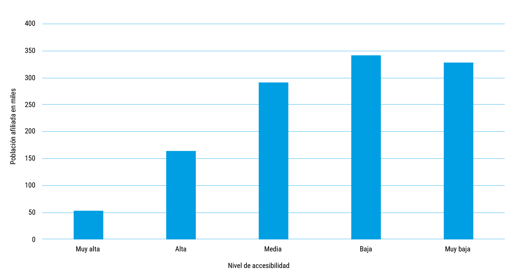 De manera agregada, los rangos de accesibilidad Muy baja y Baja contabilizan 56% de las AGEB y 57% de población afiliada. Con accesibilidad Media se tiene un conteo de 15% de las AGEB con 25% de población afiliada; y en los rangos de accesibilidad Alta y Muy alta se tiene 30% de las AGEB y sólo 18% de población afiliada (Fig. 2).