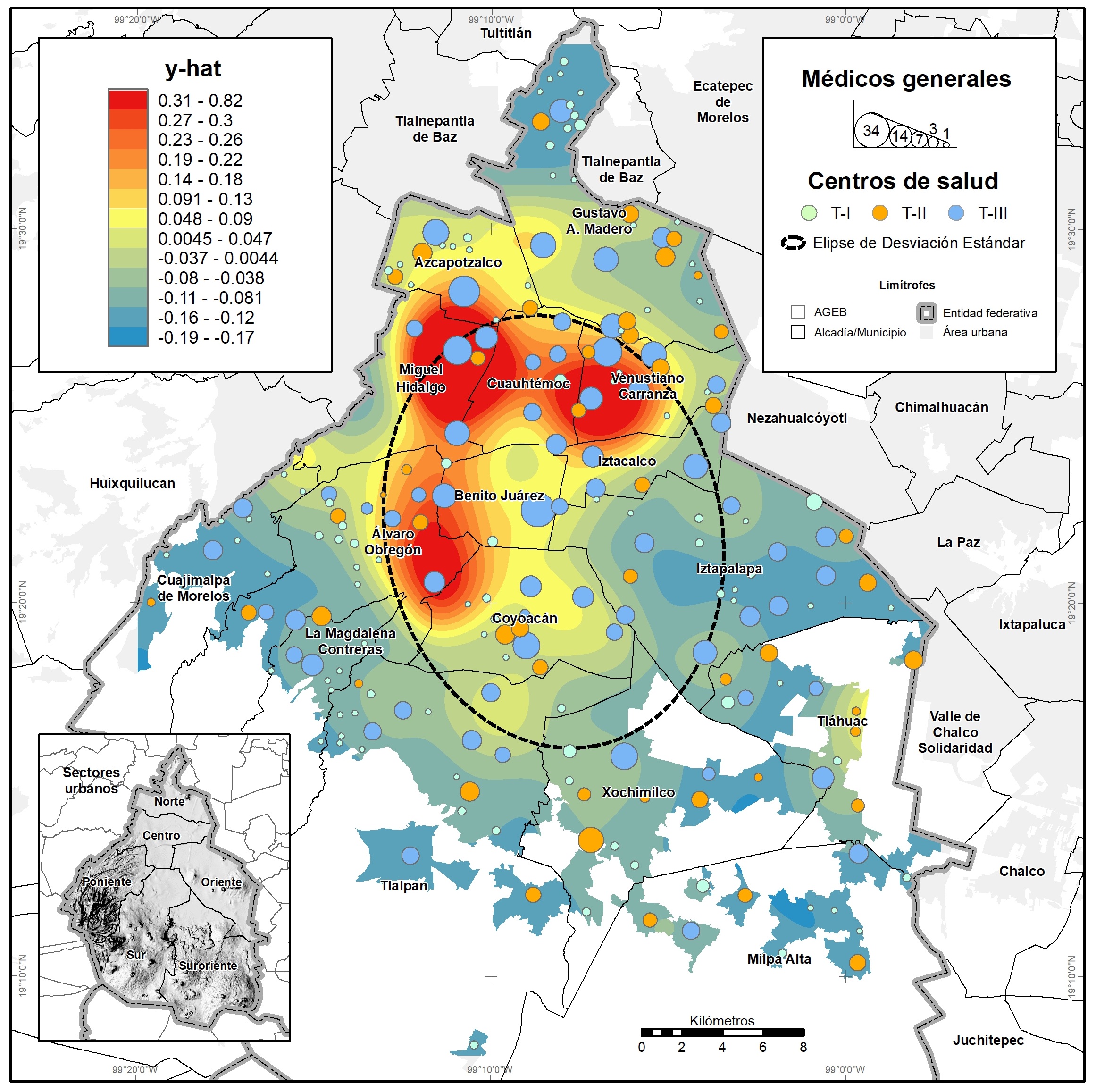 La EDS presenta un eje con alineación centro- sursureste; al agregar centros de salud, médicos y población afiliada, se obtiene que: 1) sólo 26% de centros de salud, 36% de médicos y 27% de la población afiliada, se localizan dentro de la EDS; 2) en promedio, 19% de los centros de salud T-I y T-II (de menor jerarquía) y 20% de sus médicos, se localizan dentro de la EDS; 3) 42% de los centros de salud T-III (de mayor jerarquía) y 45% de sus médicos se localizan dentro de la EDS; es decir, en el área central de CDMX (Fig. 4). Como dato adicional, dentro de la EDS la tasa de médicos por cada mil habitantes es de 1.5 y fuera es de 1.0.