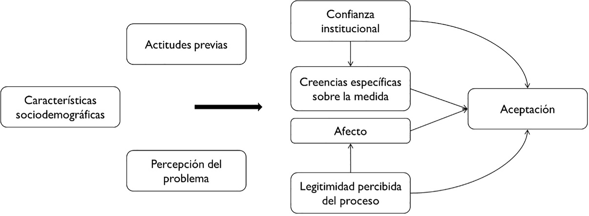Se puede considerar que existen dos bloques de factores diferenciados. Por un lado, aquellos factores individuales más cercanos a la aceptación como la confianza institucional (el nivel de confianza que el individuo posee en las autoridades responsables de implementar la medida), las creencias específicas sobre la medida (como la percepción de efectividad de la medida o la justicia de la medida) y la percepción de legitimidad del proceso de implementación de la política. Por otro lado, existen factores más lejanos que explican la aceptación o rechazo de una medida, como las características personales, las actitudes previas y la percepción del problema. Estos últimos están asociados de dos modos distintos con la aceptación. Por un lado, están asociados de modo directo (asociación baja) y, por otro lado, están asociados de modo indirecto (asociación alta), es decir, influyen en la aceptación mediados a través de los factores cercanos.