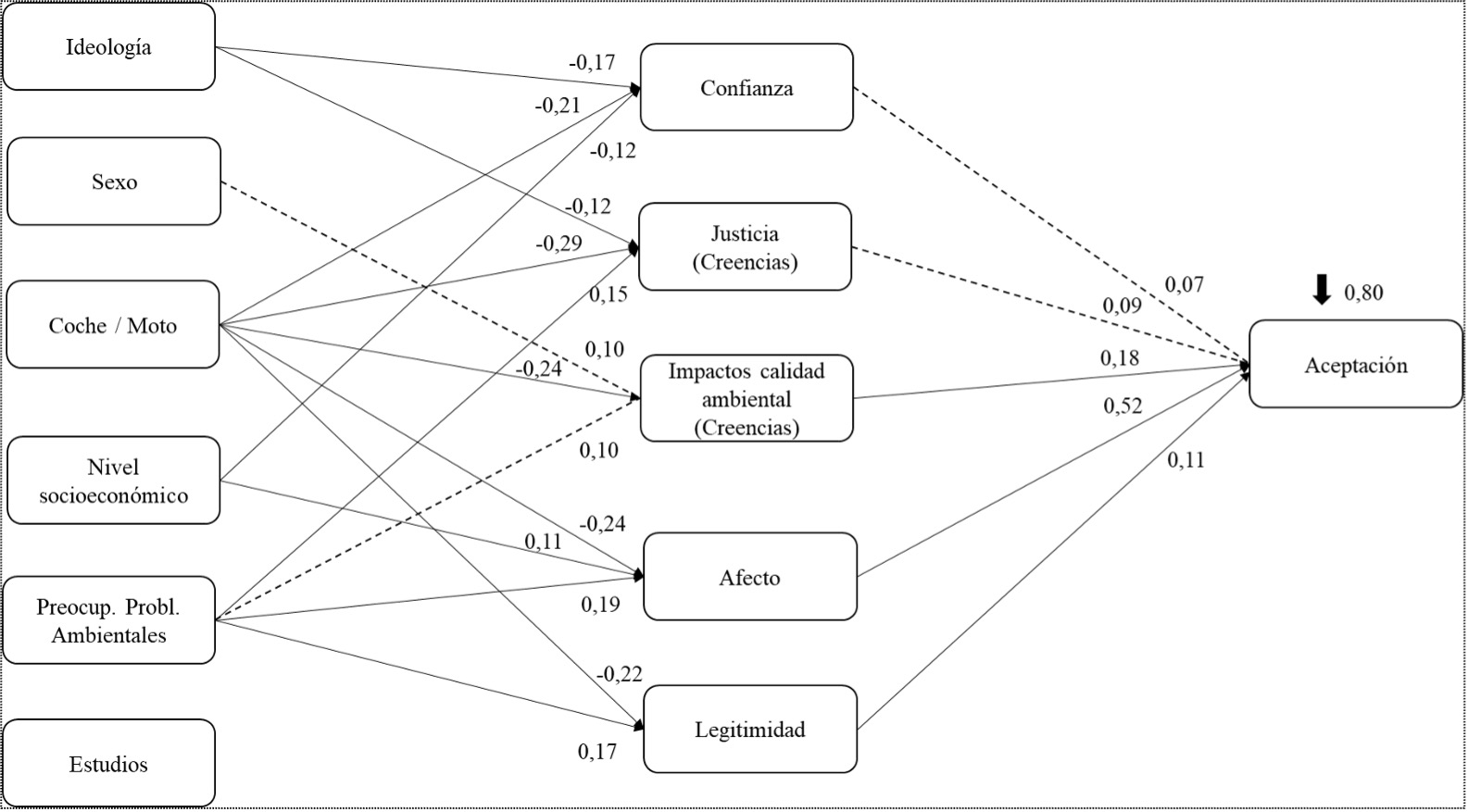 Por otro lado, hay una serie de predictores que influyen en la aceptación de las supermanzanas de manera indirecta y lo hacen mediando a través de otros predictores. Es el caso de la ideología, que influye en la aceptación a través de la confianza y la percepción de justicia; poseer coche y/o moto influye a través de la confianza, la justicia, los impactos en la calidad ambiental, el afecto y la legitimidad; la preocupación por los problemas ambientales, modulando su influencia mediante la justicia, el afecto y la legitimidad, y también los impactos en la calidad ambiental, aunque con un efecto débil; el sexo a través de los impactos en la calidad ambiental, aunque con un efecto débil pero significativo; el nivel socioeconómico de los encuestados a través del afecto y de la confianza. En el caso del nivel de estudios no se han mostrado efectos significativos ni de forma directa ni indirecta.