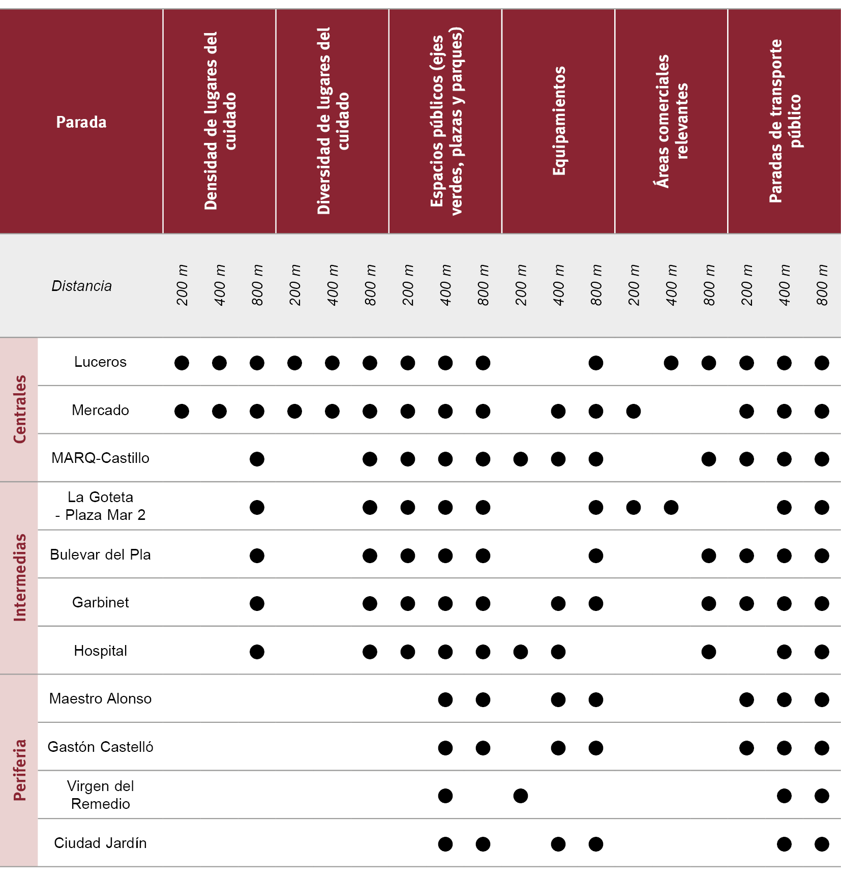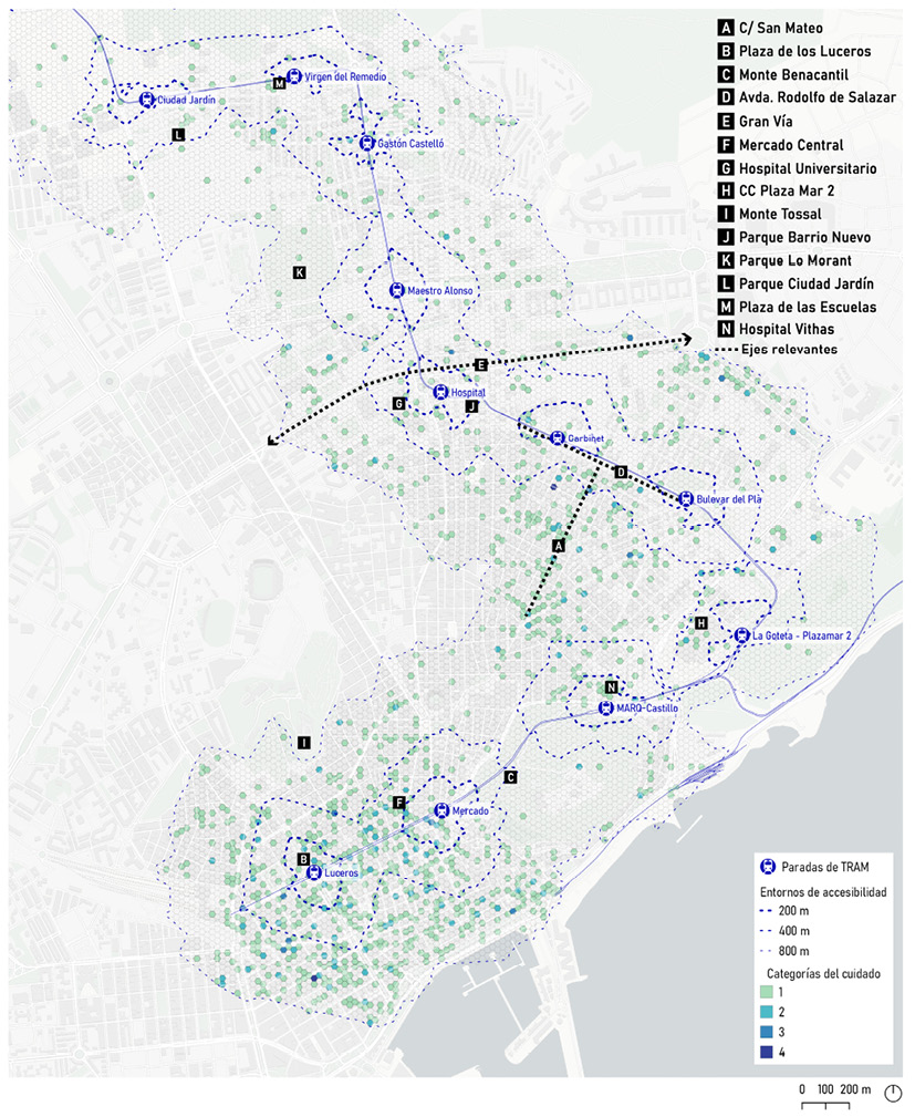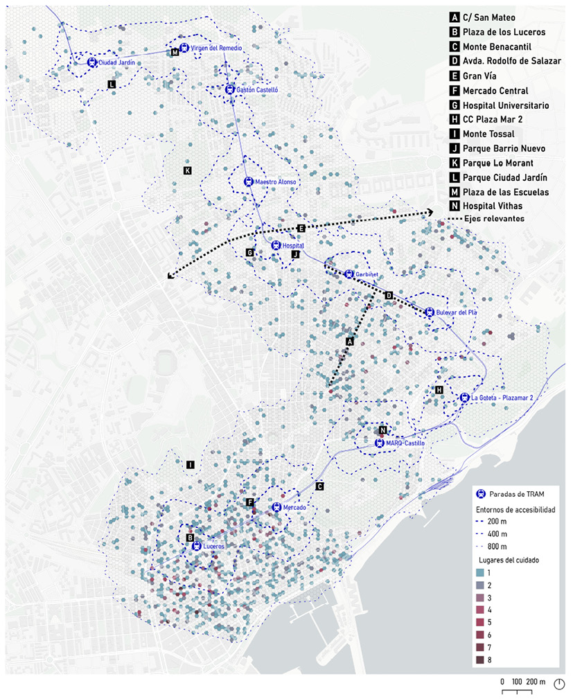 La Fig. 4 ilustra, como ejemplo representativo, la distribución de los lugares del cuidado en el segmento inicial de la línea 2 del TRAM en el centro de la ciudad. Así, se visualizan las categorías propuestas de lugares del cuidado en el entorno accesible a 200, 400 y 800 metros desde las estaciones de Luceros, Mercado y MARQ-Castillo.