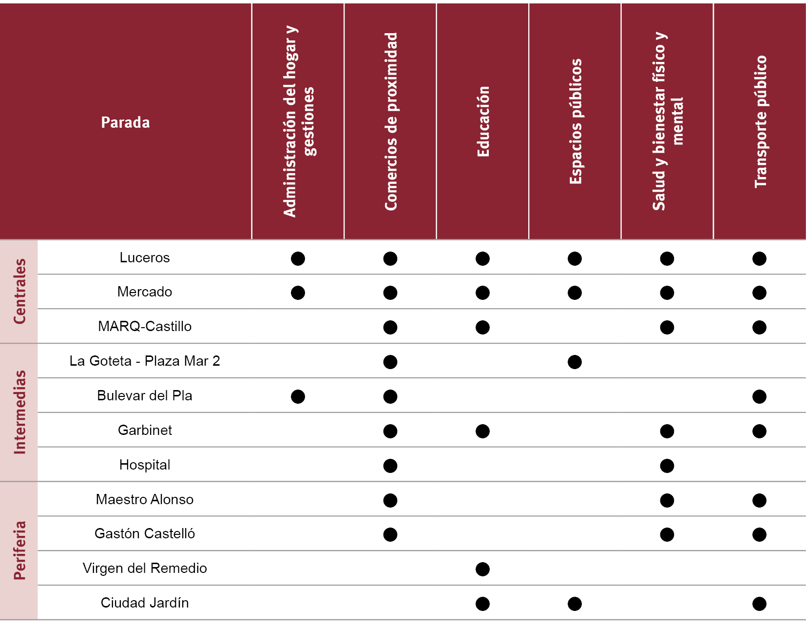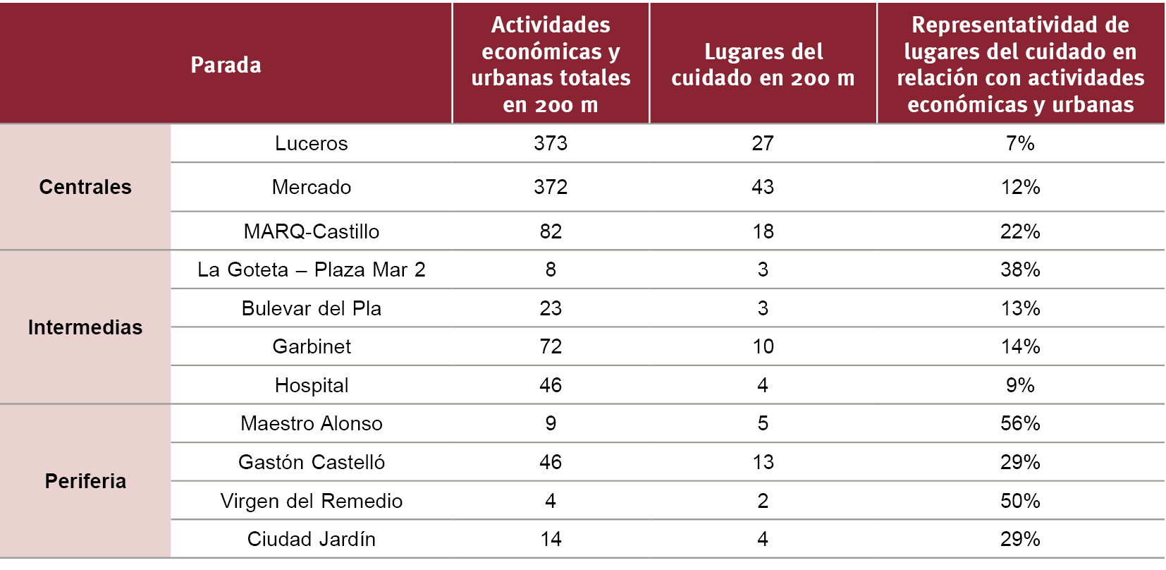 Cabe destacar que las paradas donde la proporción de lugares del cuidado supera el 25% son aquellas con una menor oferta de actividades urbanas y económicas, tales como La Goteta - Plaza Mar 2, Maestro Alonso, Gastón Castelló, Virgen del Remedio y Ciudad Jardín. De hecho, las últimas cuatro pertenecen al segmento intermedio de la línea que se extiende hacia la periferia. Resulta igualmente llamativo que en la parada de Hospital, ubicada cerca del principal hospital público del municipio, solo un 9% de las actividades económicas y urbanas del entorno accesible corresponden a lugares del cuidado.