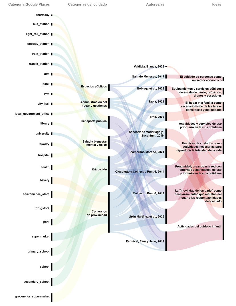La Fig. 2 ilustra los criterios previamente descritos mediante un diagrama de flujo, que muestra la relación entre diversas categorías de Google Places y las del cuidado, citando autores relevantes. Este gráfico se organiza en cuatro columnas, cada una representando un tipo de información diferente, desde categorías específicas de Google Places hasta conceptos asociados provenientes de la literatura seleccionada. La frecuencia de las conexiones entre distintas fuentes de información se aprecia a través del grosor de las bandas de flujo y el tamaño de las líneas negras, donde la longitud de estas últimas refleja el número de menciones de un lugar en la revisión bibliográfica, y el ancho de las bandas, la frecuencia de citas de lugares específicos relacionados con el cuidado. Por ejemplo, la categoría “supermarket” en Google Places se vincula con “comercios de proximidad” en la columna de categorías del cuidado, relacionándose a su vez con la investigación de Sánchez de Madariaga & Zucchini (2019) sobre la “movilidad del cuidado”.