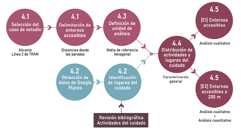 El marco metodológico comprende cinco fases (Fig. 3): [4.1] selección del caso de estudio y delimitación de entornos accesibles; [4.2] obtención de datos de Google Places, validación e identificación de lugares del cuidado según la taxonomía de lugares definida en el apartado anterior; [4.3] trazado de malla de referencia cuyas celdas son la unidad espacial de análisis; [4.4] análisis de la distribución espacial de las actividades económicas y urbanas en entornos accesibles desde las paradas de transporte público; y, [4.5] análisis cualitativo y cuantitativo de lugares del cuidado en entornos accesibles por franjas.