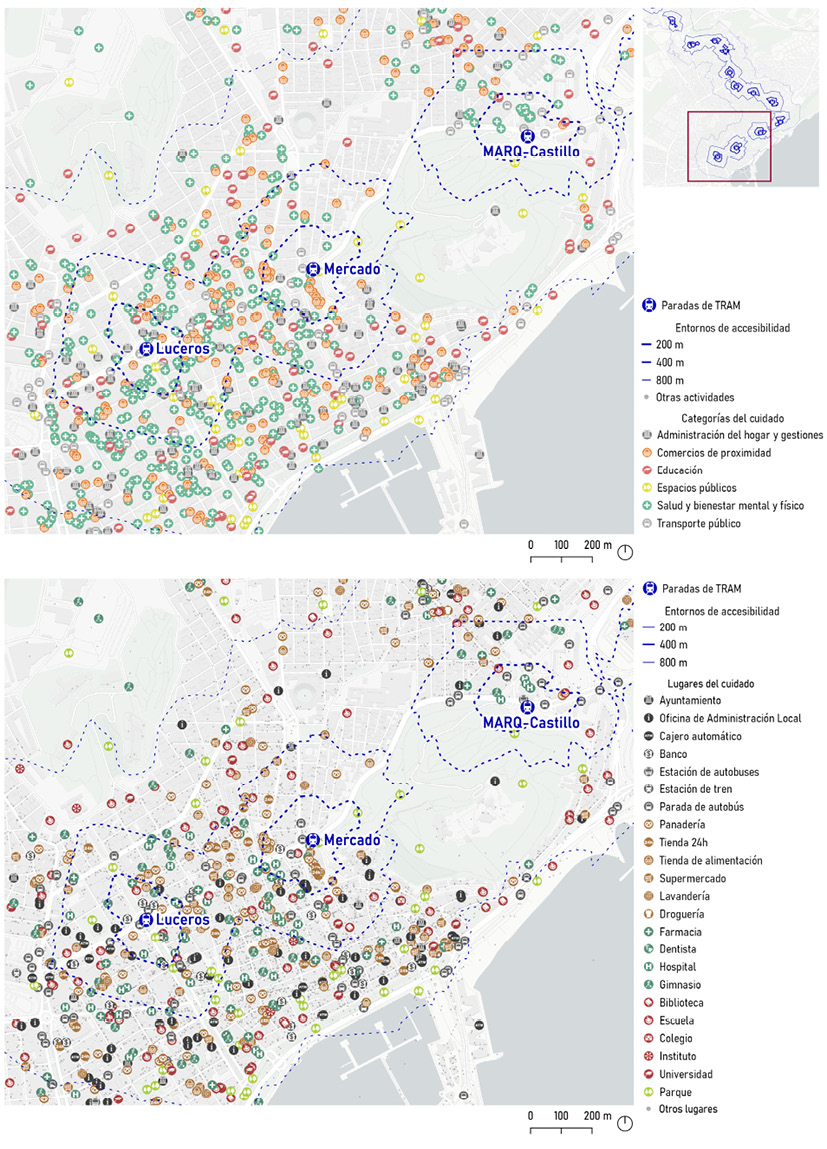 Fig. 4 / (arriba) Distribución de lugares del cuidado por categorías y (abajo) tipo de actividad en entornos accesibles desde las tres primeras paradas localizadas en el centro urbano (Luceros, Mercado y MARQ-Castillo). En línea azul la delimitación de entornos accesibles por isócronas a distancias de 200, 400 y 800 metros