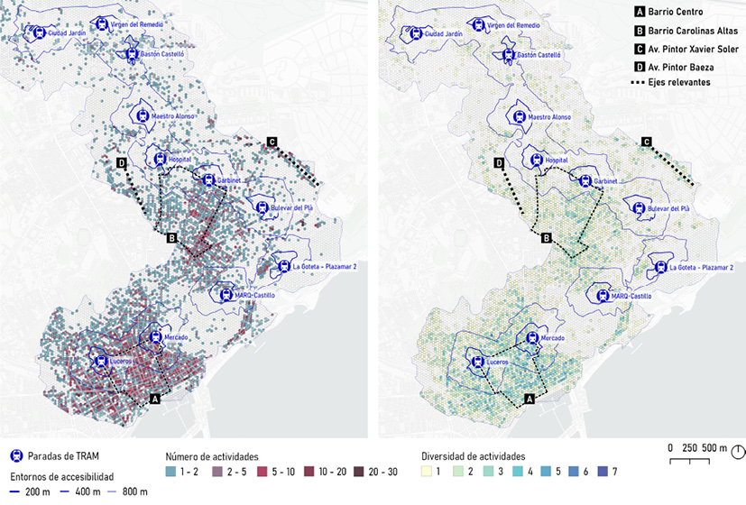 En contraposición, los barrios periféricos, donde se localizan las últimas paradas de la línea 2 del TRAM dentro del ámbito municipal, la actividad disminuye considerablemente, sobre todo en términos de diversidad. Puede observarse una cierta densidad (pero no diversidad) de actividad económica en ejes como la Av. Pintor Baeza que discurre tangencialmente a la línea isócrona que delimita los 800 metros caminables desde la parada Hospital. En los barrios del tramo intermedio de la línea, donde se identifica un mayor número de estaciones, la actividad, aunque sí se produce en el entorno proximidad de los 400 y los 800 metros de distancia desde prácticamente todas las paradas, se polariza hacia la Avenida Pintor Xavier Soler, al norte, y el área comercial dentro del Barrio de Carolinas Altas. Esta caracterización subraya que la mayor parte de las paradas no cuentan con entornos diversos en actividad económica.