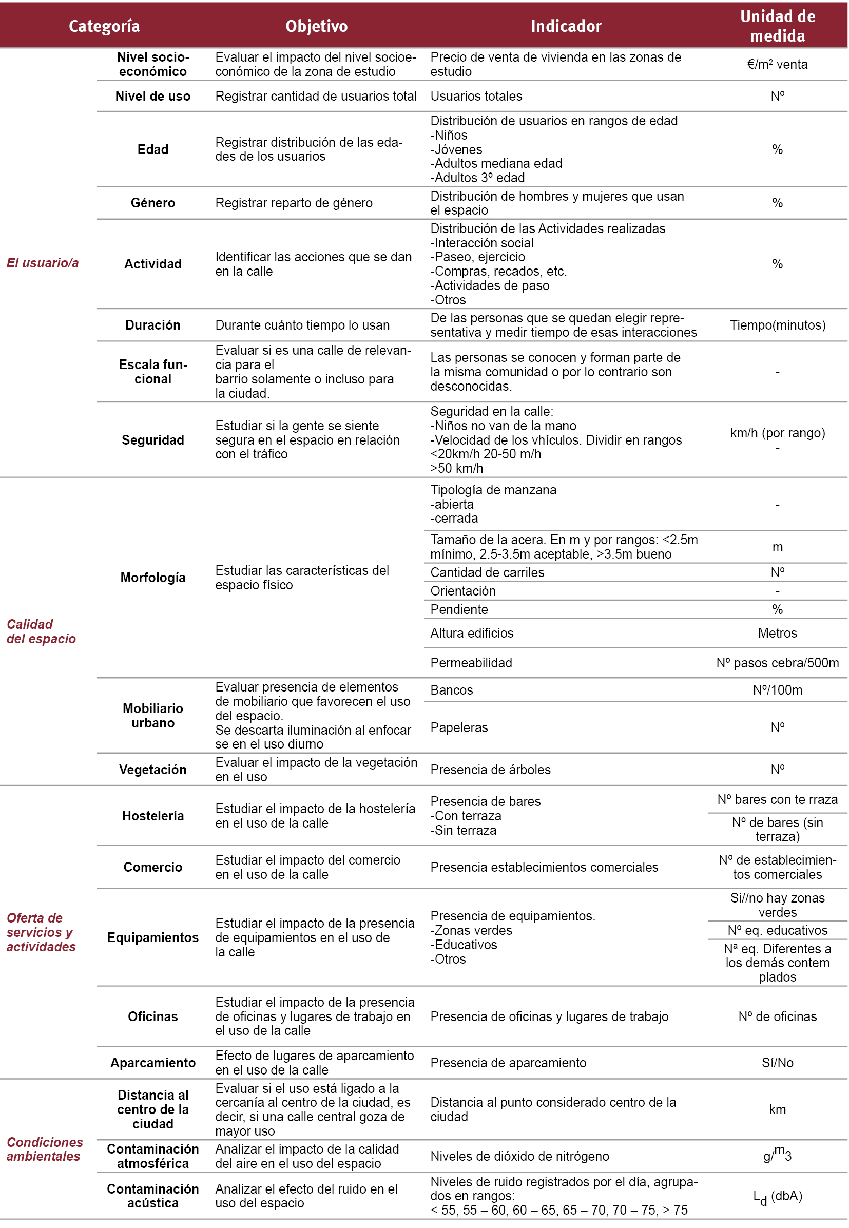 Las categorías expuestas en el punto anterior han servido a la hora de definir los indicadores que permiten valorar el uso social de la calle. Se han definido 29 indicadores, en su mayoría cuantitativos, tomados de las diversas fuentes consultadas y adaptados al contexto de trabajo cuando ha sido necesario. Todos ellos se clasifican en las 4 categorías explicadas anteriormente. La revisión bibliográfica no ha permitido encontrar un conjunto de indicadores establecidos para evaluar la aptitud de una calle con la perspectiva de este estudio, y por ello, cabe destacar el enfoque multidisciplinar con el que se ha abordado el análisis. De este modo, se mide con el mismo rigor la cantidad de bancos que hay en una calle, indicador empleado en estudios de caminabilidad, como la cantidad de NO2 en el aire, considerado frecuentemente en estudios pertenecientes al campo de la salud o calidad del medio ambiente. Esta combinación de indicadores es vital para evaluar un aspecto tan complejo como la interacción social en la calle, ya que permite relacionar si unas condiciones más salubres medio ambientalmente están vinculadas con la estancialidad en la calle, o si en cambio, tiene más peso la existencia de comercio, por citar un ejemplo. En la Fig. 1 se recogen los 29 indicadores, con su unidad de medida y clasificados en las 4 categorías.