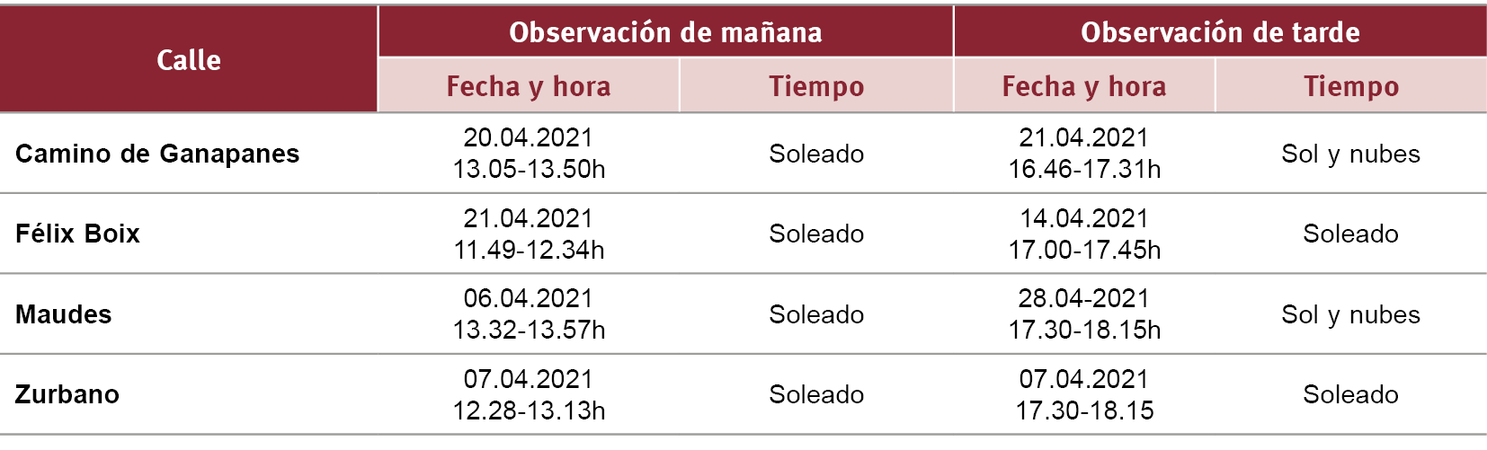 Dado que el estudio tiene como intención estudiar el uso cotidiano de la calle, el trabajo de campo se ha desarrollado en días laborables excluyendo viernes, con unas condiciones meteorológicas similares. Se analizó el uso de la calle en intervalos horarios determinados: 11.30 - 14.00 h y 16.45 - 19.00 h. Se realiza una observación de 45 minutos en cada intervalo en cada calle del análisis. Se desarrolló en el mes de abril de 2021. La Fig. 2 recoge las observaciones realizadas para cada calle: