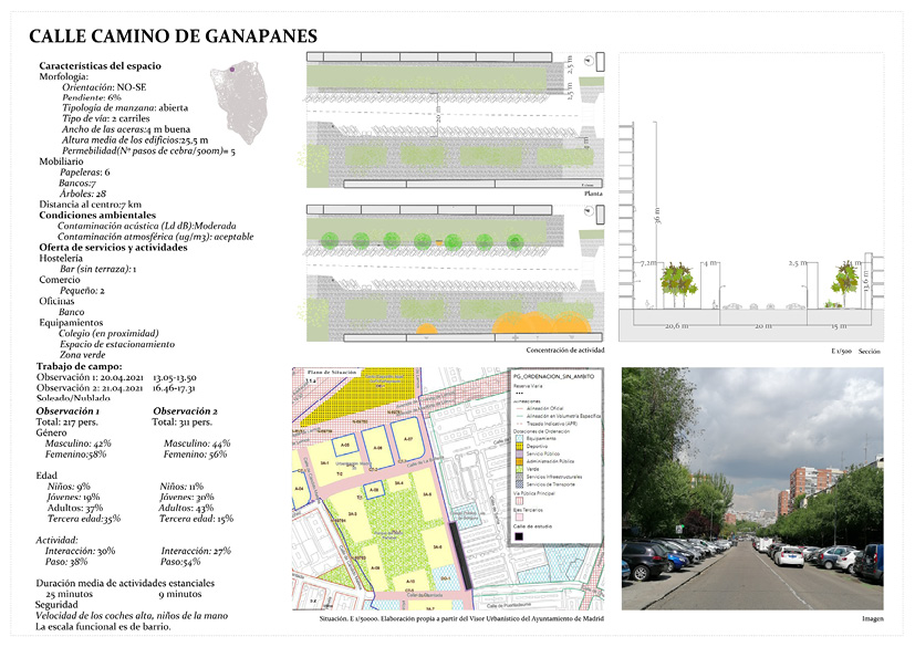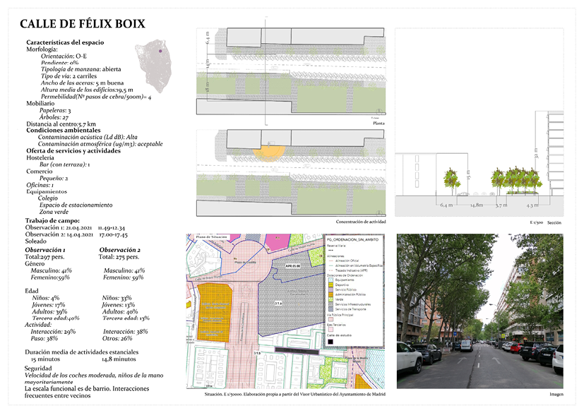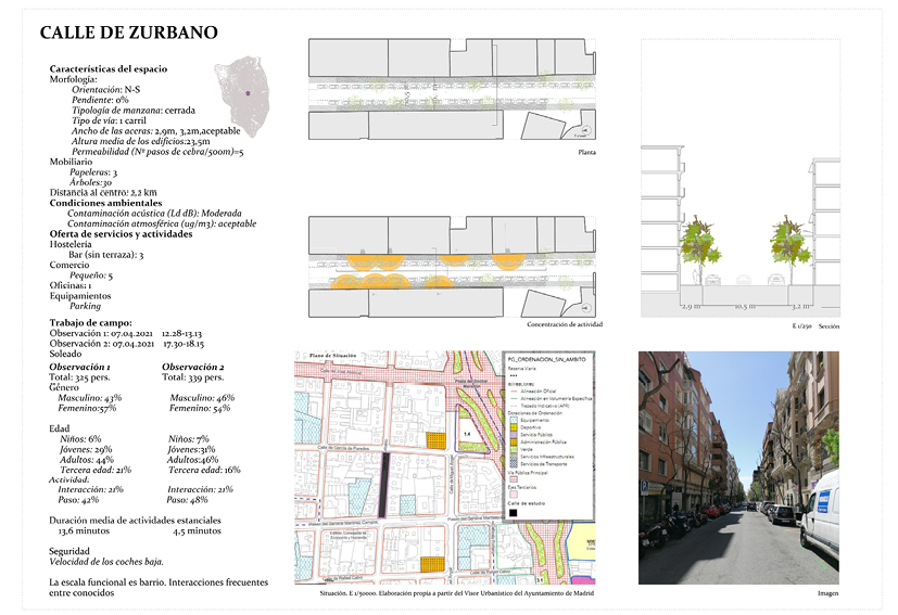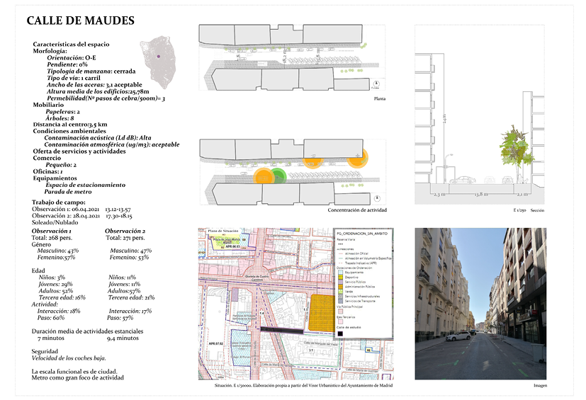 Es una calle de un solo carril con espacio de estacionamiento a ambos lados. Las aceras miden 3.1 m de ancho y es notable le presencia de arbolado y ausencia de bancos. Las manzanas son cerradas y los edificios tienen una altura media de 23,5 m. En esta calle abunda el pequeño comercio, y además hay hostelería sin terraza. En las horas en las que se ha hecho el trabajo de campo el comercio genera actividad, tanto de personas deteniéndose a entrar como parándose a mirar los escaparates. La presencia de pequeño comercio variado es positiva porque al proveer acceso a ciertos productos evita que las personas de estas zonas tengan que desplazarse grandes distancias para conseguirlos (Ministerio de Transportes, Movilidad y Agenda Urbana, 2020) generan más vida en la calle y la existencia de estímulos y variaciones en las fachadas de los edificios contribuye a que ocurran interacciones y actividades espontáneas (Gehl & Svarre, 2013). Además del comercio es notable la cantidad de personas cuyo paso por la calle está ligado al aparcamiento. Las actividades principales son el paso y la interacción, tanto por la mañana (42% y 22%) como por la tarde (48% y 21%). Por la mañana se registran 325 personas y por la tarde 339, la mayoría mujeres (57% y 54%) Los grupos de edad más comunes son adultos (44% y 46%) y jóvenes (29% y 31%).