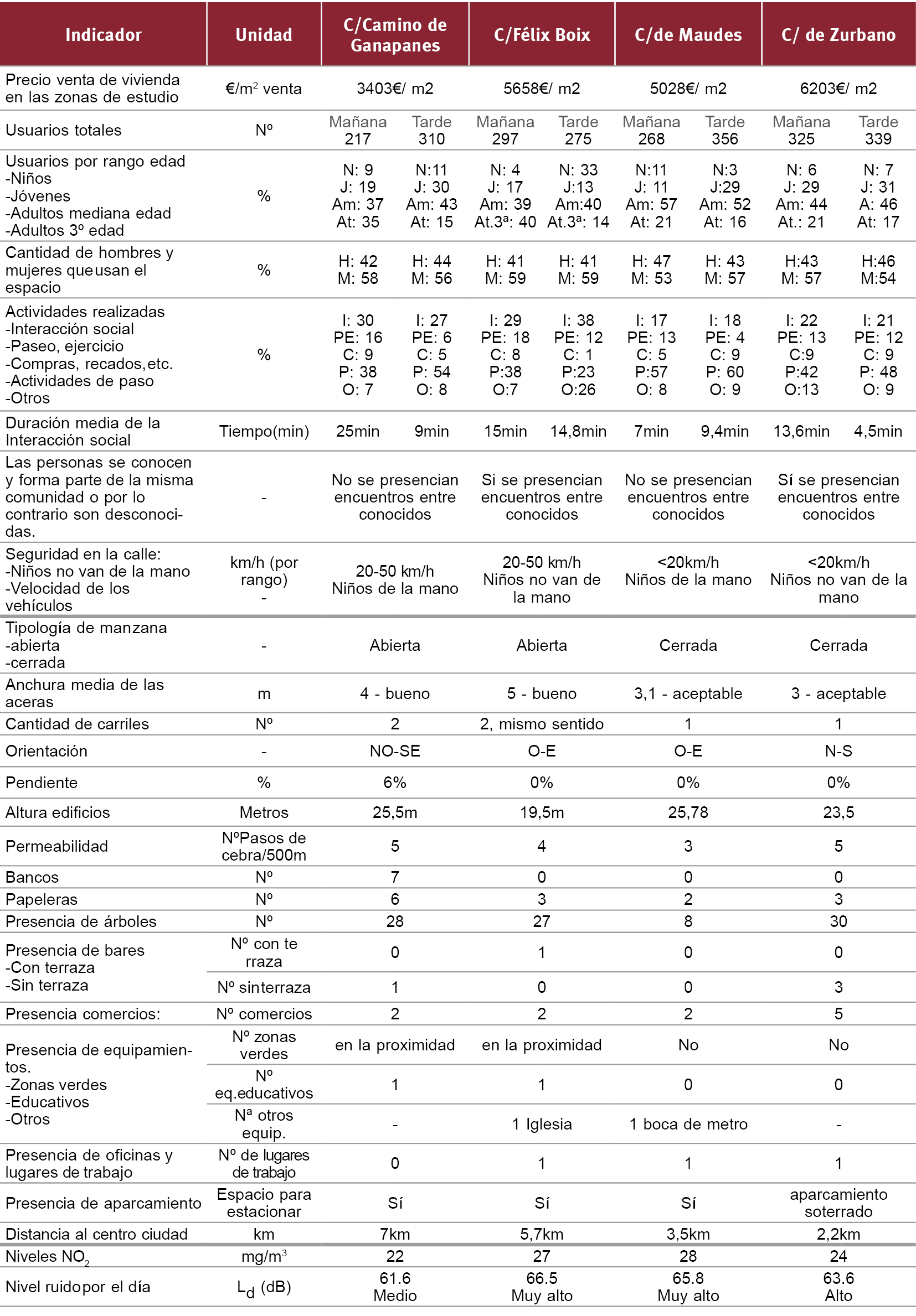 A continuación, se describen los resultados por calle, y al final de la sección se recogen fichas sintéticas que presentan los datos por indicador para cada calle (Fig. 5, Fig. 6, Fig. 7 y Fig. 8).