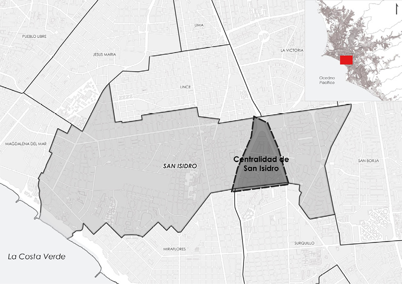 Fig. 1 / Ubicación de la centralidad financiera de San Isidro en relación al distrito y lima metropolitana