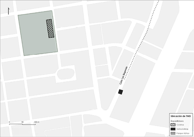 En el caso de los repartidores ciclistas, se menciona que el uso del parque Abtao para esperar pedidos es usual durante la temporada de verano ya que se pueden sentar en áreas verdes, mientras que en el invierno el pasto de dichas áreas suele estar húmedo, por lo que usan los parqueaderos públicos de bicicleta cercanos al parque. Los TMD motorizados no cuentan con la facilidad de conseguir espacios para la espera; al no disponer de mobiliario para realizar periodos de inactividad laboral prolongadas para actividades como el descanso, la espera o la alimentación. Además, se identifica una aspiración por parte de los repartidores ciclistas hacia cambiar de modo de movilizarse a la motocicleta. Esto les posibilitaría llegar a realizar mayor cantidad de pedidos con un menor esfuerzo físico, enfatizando la importancia de la experiencia corporal en la perspectiva de su apropiación del espacio (Jirón & Mansilla: 2013).