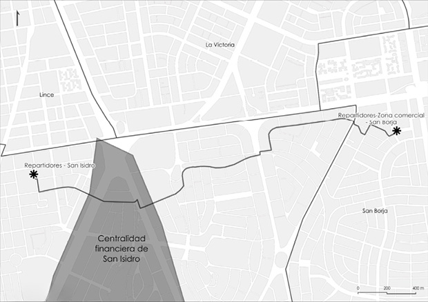 Las rutas son parte esencial de la actividad cotidiana de los diferentes TMD. Son dos las principales rutas identificadas: aquellas comunes a ambos grupos y aquellas de los motorizados. Los trayectos específicos refieren a los motorizados porque abarcan distancias que trascienden las inmediaciones de la centralidad financiera, teniendo que cubrir distritos cercanos como Lince, San Borja, La Victoria, pero también otros más distantes como Miraflores. Los circuitos de los TMD permiten unir puntos discontinuos y distantes en el tejido urbano, sin perder la perspectiva de conjunto y de pertenencia (Magnani, 2002) en su habitar urbano. Uno de los recorridos identificados es el de una ruta que responde a esa noción de continuidad en torno a la ciudad: el caso de algunos de los repartidores ciclistas que unen puntos entre los distritos de San Isidro y San Borja, colindantes entre sí (Fig. 7), en el desarrollo de su práctica laboral cotidiana y mediante el cual se apropian del espacio usando la estructura material urbana y las reglas que gobiernan su uso para sus propósitos.