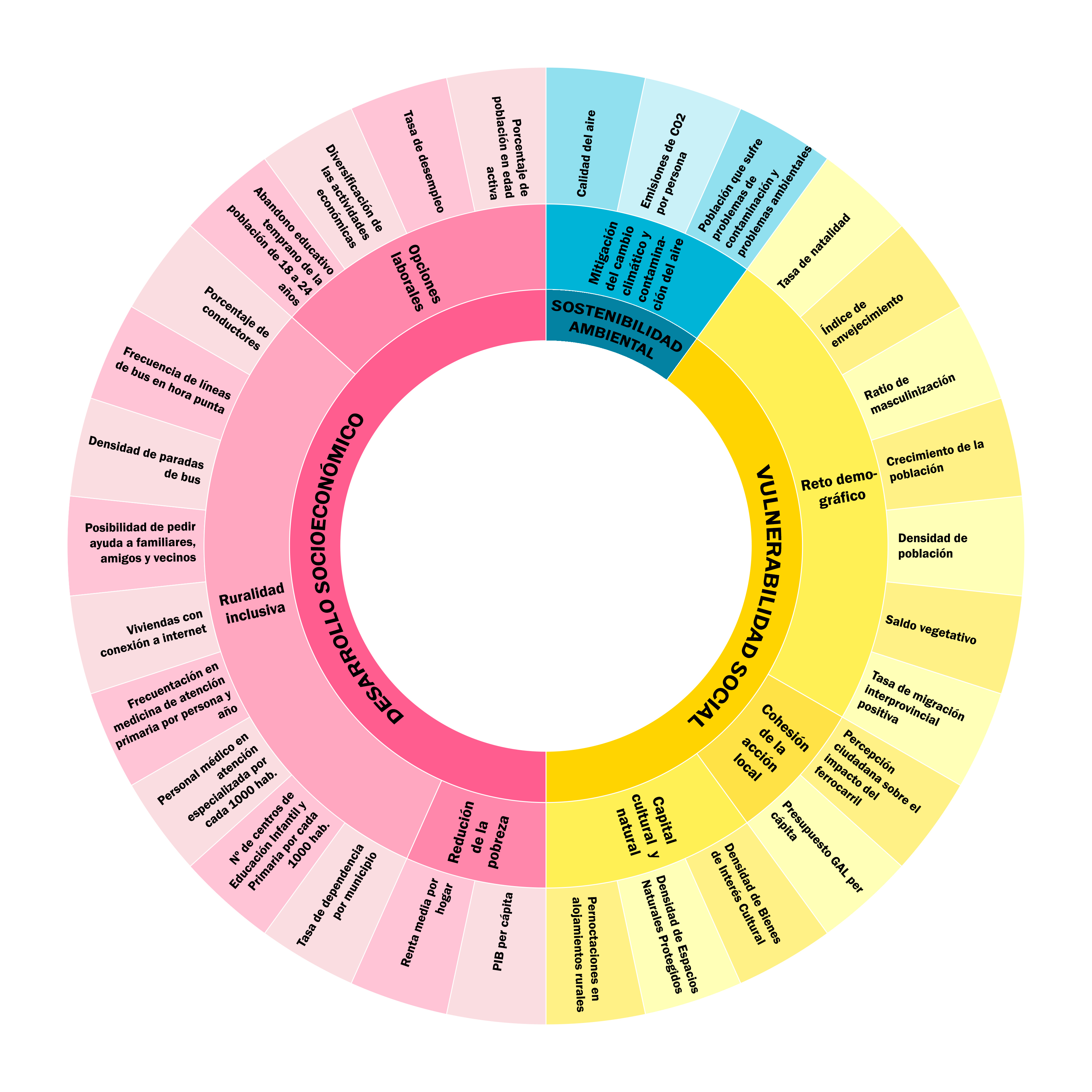 En el primer nivel, más general, se ha optado por una estructura tripartita y que tome en consideración los aspectos que determinan de forma completa las condiciones del territorio. Así, se han establecido 3 ámbitos generales de análisis alineados con el concepto de desarrollo sostenible: la sostenibilidad ambiental; la vulnerabilidad social y el desarrollo socioeconómico.
