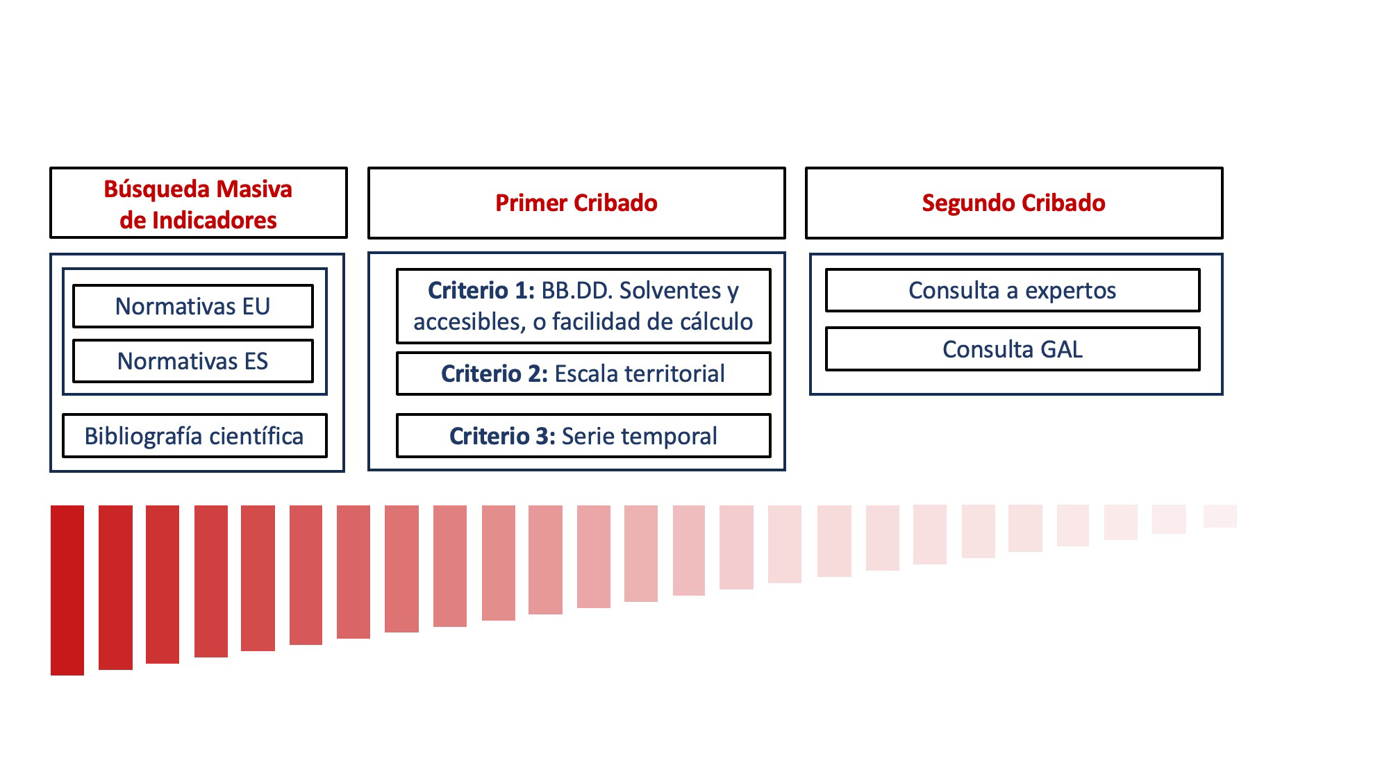 La siguiente fase ha consistido en el cribado de estos indicadores preliminares atendiendo a tres criterios: disponibilidad de datos combinado con la facilidad de cálculo, escala territorial relevante y representatividad temporal (Fig. 3).