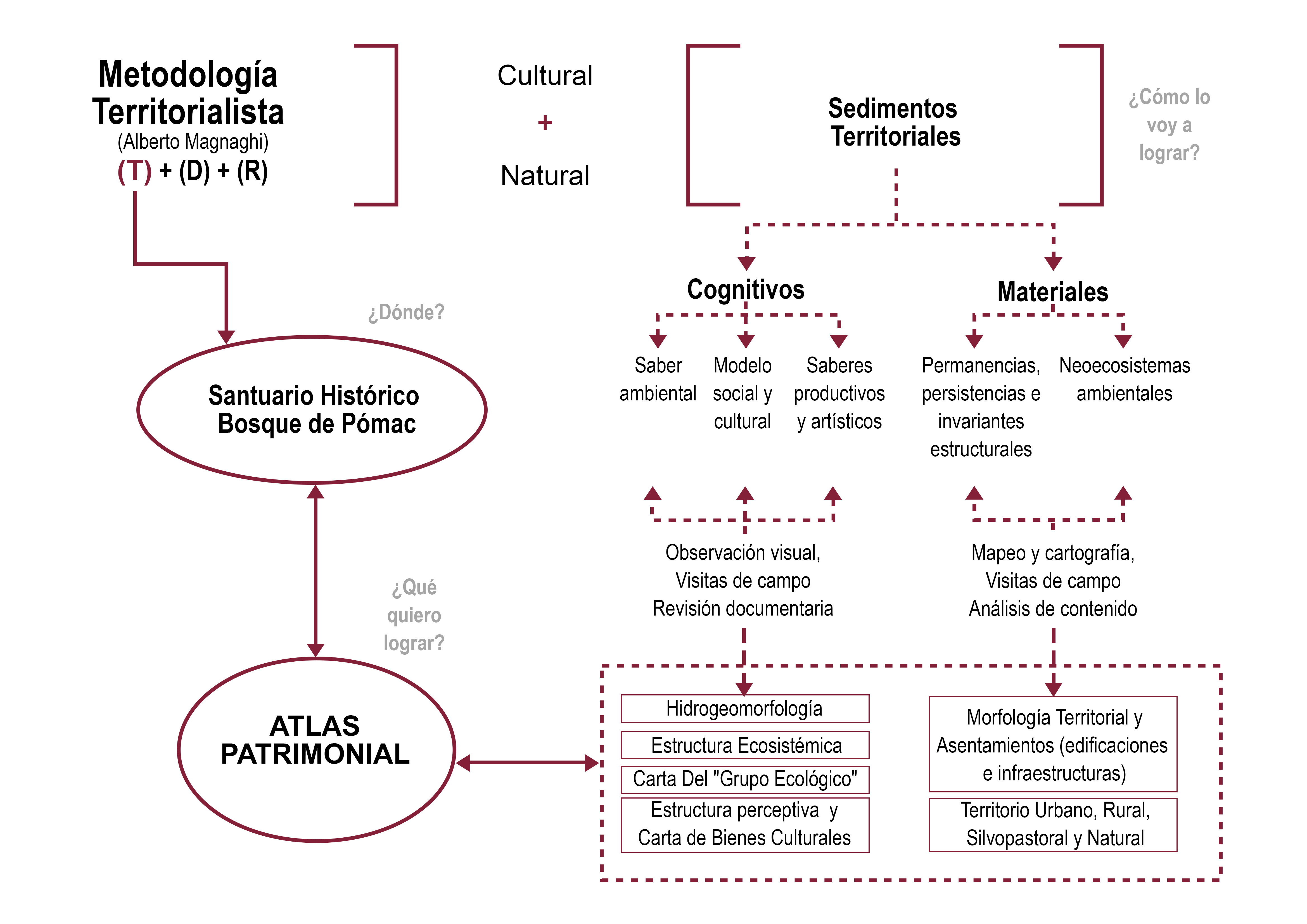 La metodología utilizada está basada en la analítica para la proyección identitaria del territorio propuesta por Alberto Magnaghi y la escuela territorialista italiana. Se consideraron dos aspectos el cultural y el natural, que conllevan a los sedimentos territoriales compuesto por sedimentos cognitivos y sedimentos materiales. El sedimento cognitivo está conformado por los saberes ambientales, modelo social y cultural, y saberes productivos y artísticos; de donde se obtuvieron, mediante la observación visual, visitas de campo y revisión documentaria, las capas de hidrogeomorfología, estructura ecosistémica, carta del grupo ecológico, estructura perceptiva y carta de bienes culturales. Mientras que, los sedimentos materiales constituidos por las permanencias, persistencias e invariantes estructurales y neoecosistemas ambientales; se obtuvieron mediante el mapeo y cartografía, visitas de campo y análisis de contenido las capas de morfología territorial, territorio urbano rural, silvopastoral y natural y asentamientos (edificaciones e infraestructuras). La selección y jerarquización de capas se apoya en repertorios metodológicos de los planes paisajísticos de Toscana y Puglia, que orientan la lectura multiescalar del territorio y la traducción cartográfica de los valores patrimoniales. (Regione Toscana, s. f.; Regione Puglia, s. f.) Todas estas capas conllevaron a la propuesta de un atlas patrimonial cuyo propósito es contribuir con el análisis de las condiciones de preservación, promoción y desarrollo del patrimonio, analizando los ciclos de territorialización en el Santuario Histórico Bosque de Pómac (Fig. 3).