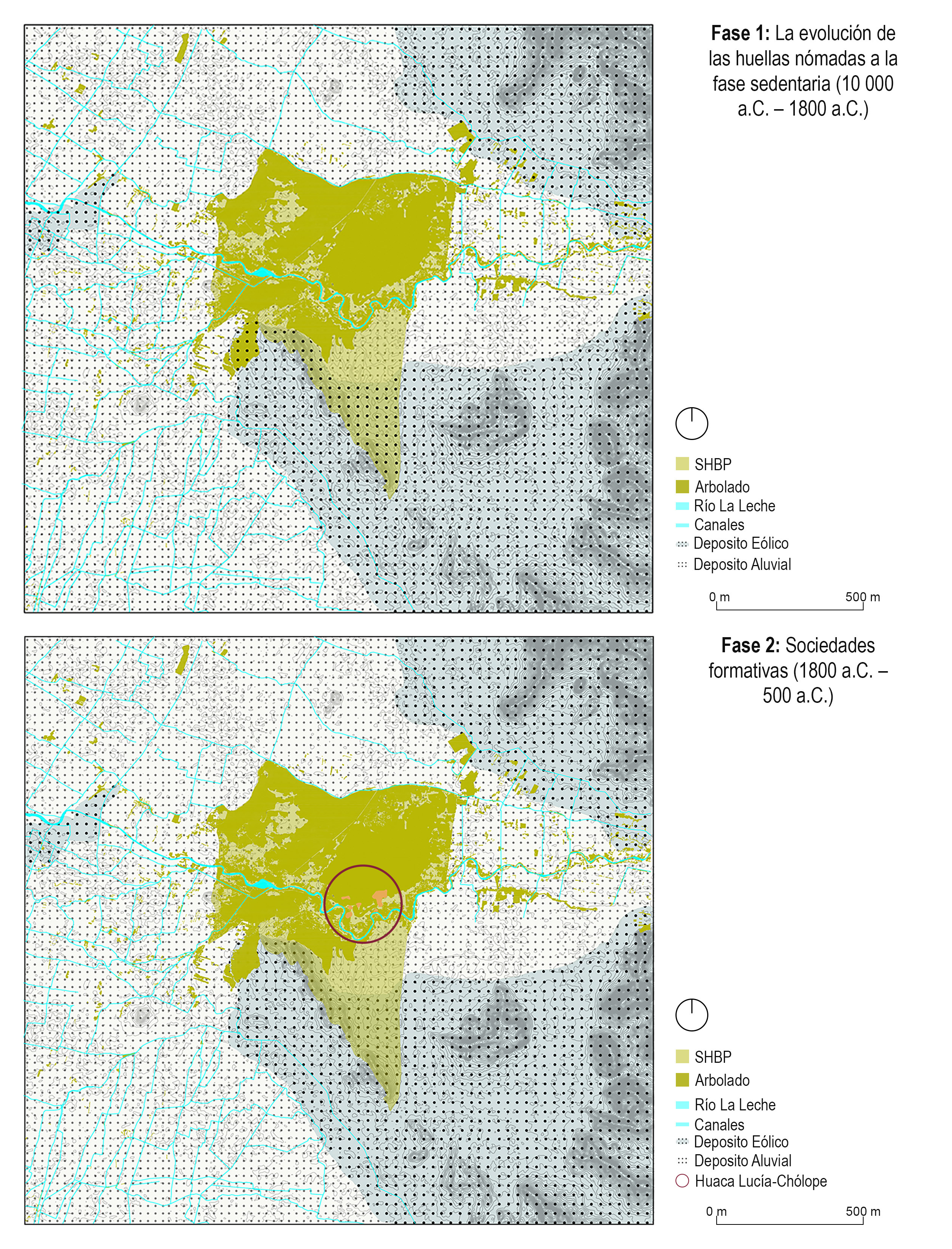 El Santuario Histórico Bosque de Pómac, ubicado en la costa norte del Perú, ha sido testigo de una serie de transformaciones territoriales a lo largo del tiempo, las cuales han dejado huellas en su paisaje. Estas transformaciones han sido representadas a través de un conjunto de cartografías de las cinco fases desde los primeros asentamientos humanos hasta la actualidad. Se busca comprender los procesos que han dado forma a este espacio natural y cultural. Según Rivasplata- Varillas (2014), en su artículo “Cambio de Paisajes de la costa norte peruana desde una perspectiva histórica y geográfica” expone que el terreno es el área concreto modelado y estructurado por las sociedades benefactoras a través de un acopio de prácticas deslucidas y triunfantes que ha dado como resultado los efectos obtenidos de esta cultura geográfica: los horizontes.