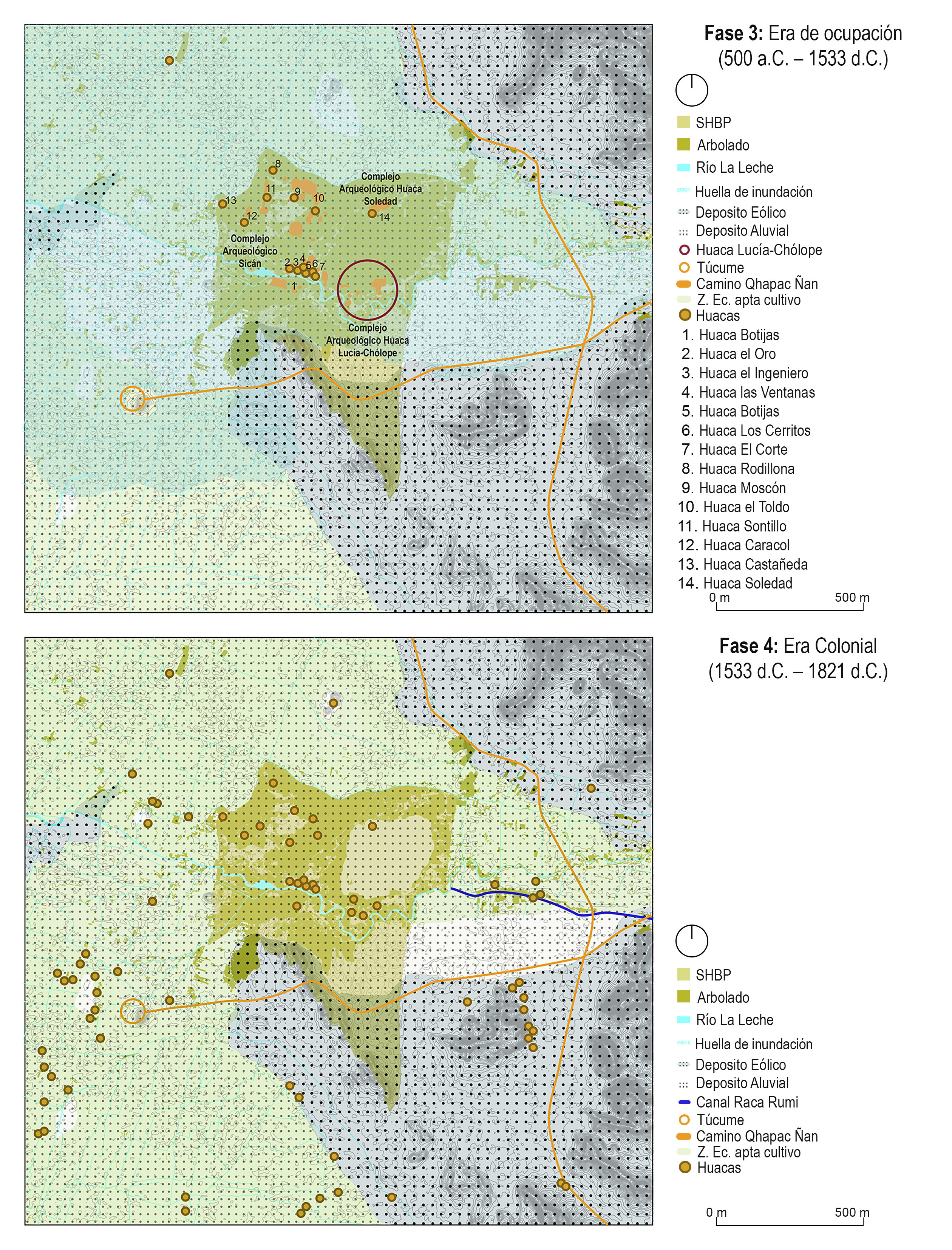 Durante este período, se construyó el magnífico centro ceremonial conocido como el Templo de las Columnas en Huaca Lucía - Chólope, dentro del SHBP. El emplazamiento del centro ceremonial, en la planicie aluvial, a lo largo del cauce del río La Leche, demuestra la jerarquía de la horticultura en estas culturas instructivas, cuyas huellas pueden descubrirse en los vestigios de habitación de estos pueblos (SERNANP, 2016). La forma y dirección en la que se ubican los sitios ceremoniales en los valles desempeñan un papel fundamental en la formulación de ideas sólidas relacionadas con la administración y regulación del espacio territorial (Fig. 4).