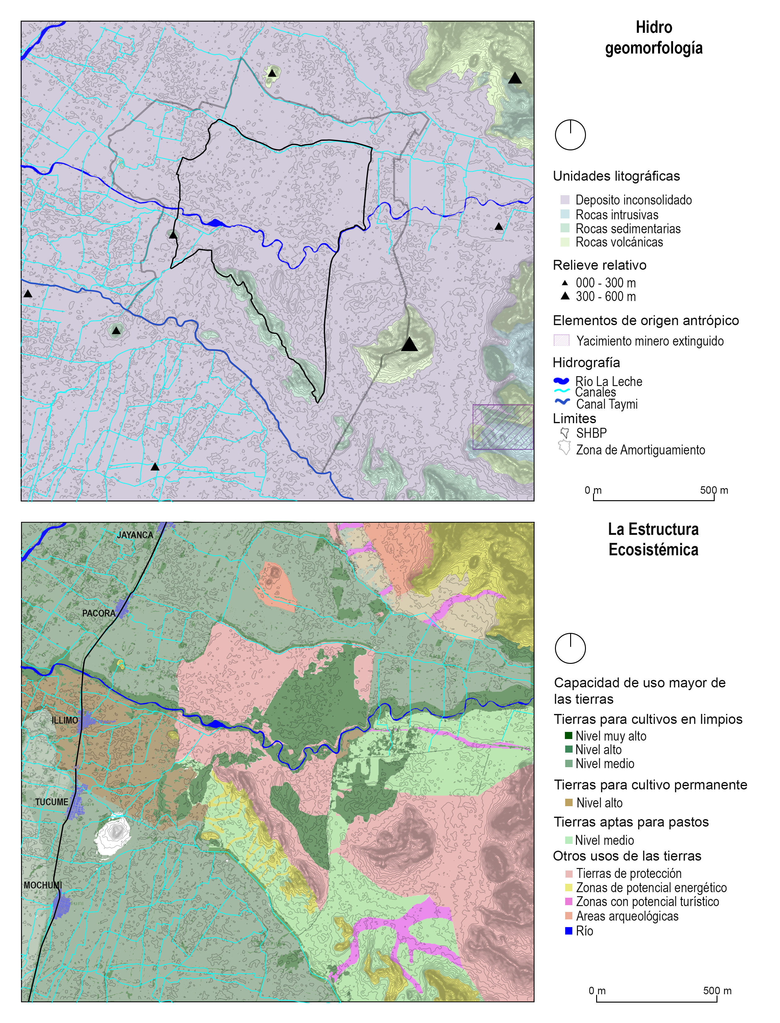 Presenta un mosaico disperso de suelos variados. En zonas aledañas a los cultivos se encuentran plantas de algarrobo, sapote, faique, que son especies prioritarias adaptadas a duras condiciones (MINAM, 2019). Al norte del río La Leche, las tierras son aptas para la protección y tierras de cultivo en limpio; mientras que, al sur las tierras son de protección, aptas para cultivo en limpio y potencial energético. Esta paleta de tipos de ecosistema se ve limitado por el recurso hídrico, debido a que se altera las condiciones de riego. “Este cauce es activado cíclicamente por las lluvias ocasionadas por el Fenómeno El Niño, colmando el valle de sedimentos fértiles aprovechados por una agricultura que mantiene cultivos ancestrales a partir de un sistema de riego que conserva aún canales prehispánicos” (SERNANP, 2019). (Fig. 7).