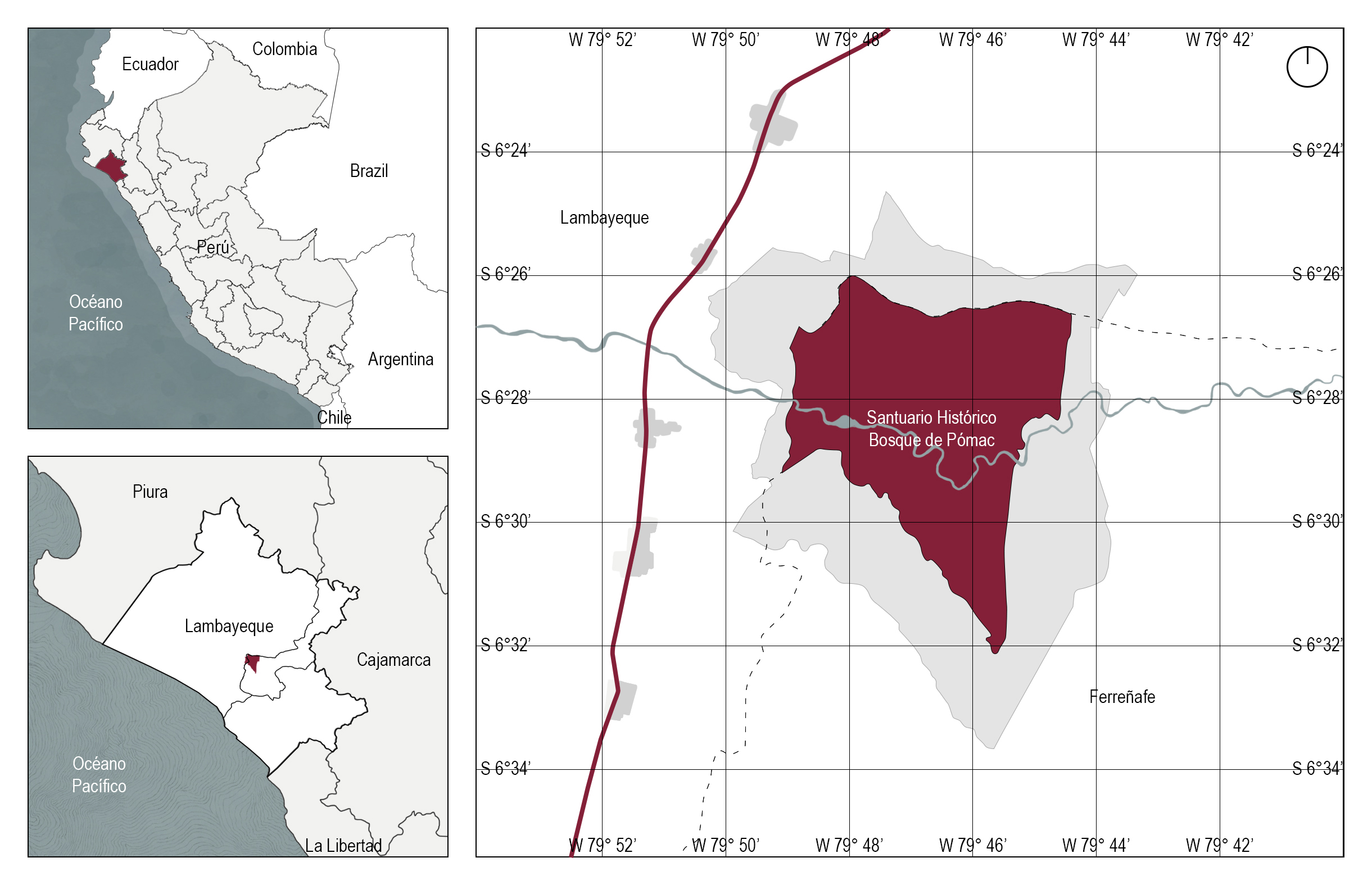 Entre los bosques secos más representativos de Perú se encuentra el Santuario Histórico Bosque de Pómac (SHBP), un área de conservación natural ubicada en la costa norte peruana (Fig. 1). Este espacio natural es declarado por la Ley N° 26834 de Áreas Naturales Protegidas (ANP), por su valor como patrimonio histórico, arqueológico y natural, especialmente por la presencia de bosques secos de algarrobo y el sitio arqueológico de Sicán. La investigación propone esta área de estudio y tiene como objetivo identificar los ciclos de territorialización mediante un atlas patrimonial del Santuario Histórico Bosque de Pómac. La investigación se basa en una adaptación de la metodología TDR (Territorialización - Desterritorialización - Reterritorialización) de la escuela territorialista italiana, liderada por el geógrafo y teórico italiano Alberto Magnaghi, y constituye un recurso invaluable para comprender la conexión entre cultura, territorio y patrimonio en esta área geográfica.