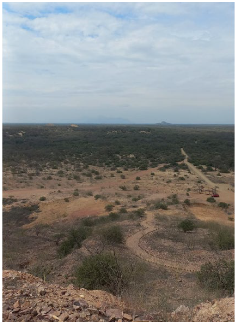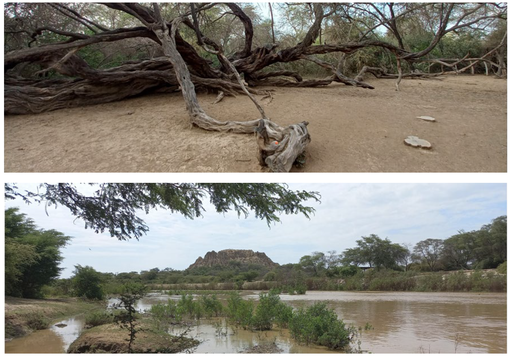 La conservación de estos ecosistemas se ha destacado como una prioridad, y se han propuesto medidas como la creación de programas de pagos por servicios ambientales (Liriano y Arias, 2023), y la reforestación con árboles tolerantes a la sequía (Fuentes-Hernández et al., 2019). Además, se ha subrayado la importancia de comprender la regeneración natural de las especies forestales en el bosque seco tropical (Cabrera et al., 2020), así como de evaluar los efectos sociales de los posibles cambios climáticos en estos ecosistemas (Powers, 2019). La desterritorialización del bosque seco es un fenómeno que no solo afecta la ecología, sino que también tiene implicaciones en el ámbito antrópico. Como es el caso del Santuario Histórico Bosque de Pómac (SHBP), siendo una reserva natural de bosque seco, cuyo árbol representativo es el algarrobo. Está conformado a su alrededor por trece caseríos, que son: La Curva, Huaca Partida, La Zaranda, Los Aguilares, Pómac III, Santa Rosa de las Salinas, Sapamé, Los Sánchez, Huaca Rivera, La Piña, El Verde, Santa Clara, y Ojo de Toro. El río La Leche lo atraviesa de oriente a occidente y presenta un complejo arqueológico de Sicán. Todo esto envuelto en una zona de amortiguamiento que colinda con los distritos de Jayanca, Pacora, Illimo, Túcume y Mochumí (Fig. 2).