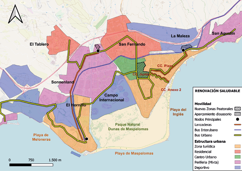 Los fuertes cambios de usos de suelo y edificatorios se representan en el fortalecimiento de la importancia del centro urbano alrededor del Centro Comercial Jumbo – a través de cambios de tipológica edificatoria y el uso de edificaciones que actualmente son exclusivamente turísticas (Fig. 1) – y de unos espacios públicos que se posiciona en el centro de un entendimiento del modelo turístico menos segregado con más lugares de encuentro entre residentes y turistas. De esta forma, la reestructuración de la ciudad se basa en la disolución de barreras físicas (ej. GC-500), el diseño a escala humana y el aumento de usos mixtos en las zonas de encuentro. Además, la mayor importancia de la cultura y la sostenibilidad genera la transformación urbana a través de la creación de refugios climáticos (i.e., espacios de sombra con vegetación y producción de energía fotovoltaica), junto con la transformación de complejos de bungalós en centros sociales, culturales y educativos y la reconversión de espacios turísticos privados en parques públicos (ej. Campo Internacional de Golf se transforma en un Jardín Botánico). La movilidad que acompaña a este nuevo modelo turístico y urbano supone una reducción de la movilidad privada y de la intermunicipal, como consecuencia del aumento de la población residente. Esto redundará en cambios en un paisaje urbano en el que se reducirán las plazas de aparcamiento y el tráfico en detrimento de infraestructura peatonal y ciclista. Esto será posible con la creación de aparcamiento disuasorios en los bordes urbanos, que estarán conectados con servicios de lanzadera con los puntos de interés (i.e. playas) y la red de transporte urbano.