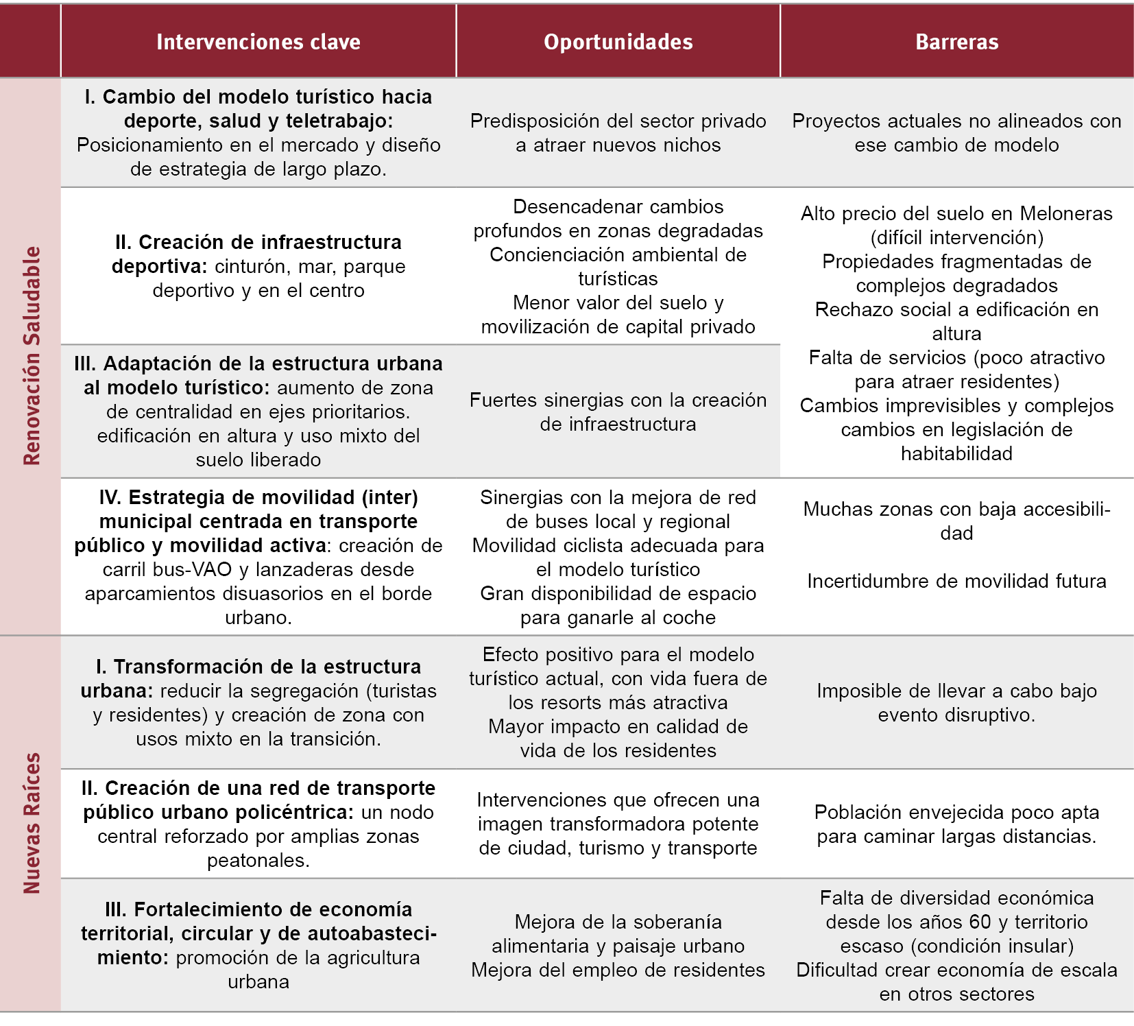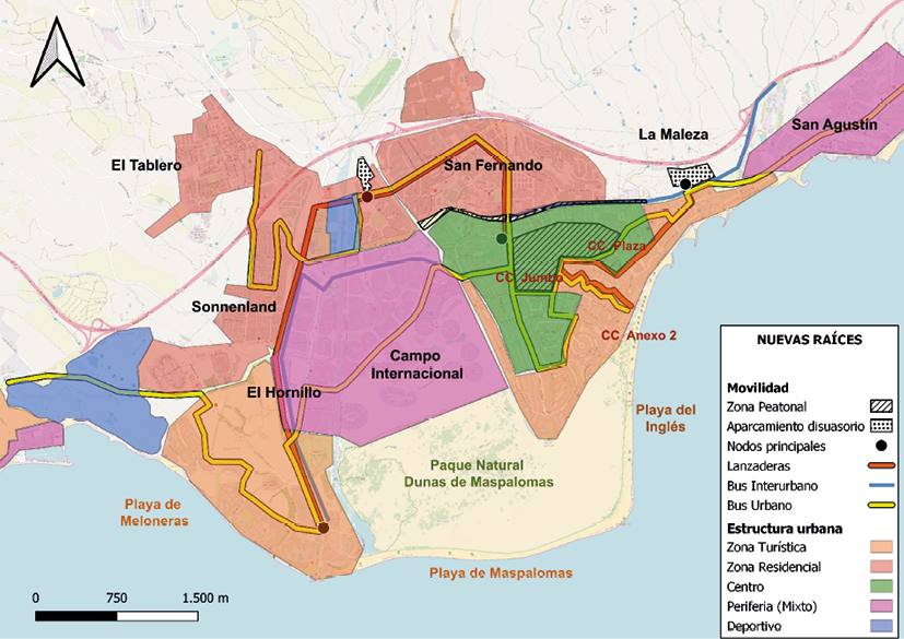 De igual manera, en la fase de discusión con expertos se puso en valor la diferencia de los nuevos marcos de discusión. Esto quedó representado en las discusiones complejas que hacían explícita la importancia de la visión que tiene el modelo turístico de la relación entre turistas y visitantes, a través del nuevo rol los espacios públicos que pone en cuestión la necesidad de recuperar espacio a zonas privatizadas y al automóvil. Esto se hace tangible en el escenario de Nuevas Raíces con la asociación entre la movilidad en la ciudad (peatonalización de la GC-500, una de sus arterias) y la visión un modelo turístico menos segregador. Esto dio forma a una estrategia basada en un ejercicio de equilibrio entre zonas más residenciales y otras más turísticas, que refleja el potencial que tienen intervenciones en las zonas concretas, como aquellas más degradadas del interior de Playa del Inglés. Así, se identifica el área con valor estratégico para la transformación de la identidad de la ciudad que responde a la necesidad de vertebrar su estructura y promover el valor de los espacios públicos más allá de las zonas comerciales y la línea costera.