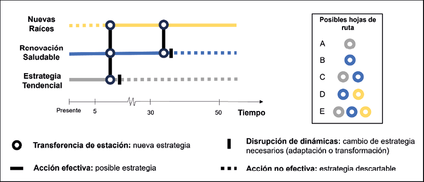 En primer lugar, el valor de estos procesos de cocreación de escenarios como marco para el diseño de estrategias fomenten la resiliencia pueden ser vital a la hora de buscar consensos entre actores clave que forman parte de los procesos de planificación y tomar de decisiones tan necesarias como difíciles. Por un lado, la integración de la fragilidad territorial en el centro de la conversación estratégica permitió plantear si las intervenciones actuales son las más adecuadas para favorecer la resiliencia urbana y territorial en un futuro plausible. Los ejemplos más llamativos son los casos del parque temático para el turismo de masas (Siam Park) y el proyecto regional de un tren que conecte el litoral este de la isla. Ambas intervenciones fueron cuestionadas por los participantes y se percibieron como contraproducentes en el escenario disruptivo. De esta forma, el ejercicio permite reflexionar sobre proyectos vinculados a una visión tendencial y como estos pueden ser un freno para modelos alternativos. Por lo tanto, el evento disruptivo seleccionado, parece ser relevante para considerar visiones de renovación turísticas que vayan más allá de un aumento del número de visitantes (Temes-Cordovez, 2017). Dadas las macrotendencias que apuntan a los límites del modelo turístico actual (Higham & al., 2016), parece que este tipo de ejercicios ofrecen una conexión entre problemas locales y globales. Por otro lado, el carácter estratégico de la discusión generada alrededor de los escenarios se ha podido apreciar en la complementariedad que existe entre ambas estrategias. En los marcos de planificación adaptativa, esto suele representarse utilizando un plano de metro como símil (Fig. 5). En este caso, las líneas del diagrama señalan estrategias efectivas (líneas continuas) que podrían dejar de serlo si cambian las dinámicas tendenciales. Los cambios de estación representan las disrupciones señalan momentos donde el cambio es necesario. Por lo tanto, el valor de “Renovación Saludable” aumenta al entenderlo también como un modelo urbano desde el que se podrían acometer transformaciones más profundas en caso de que la demanda futura se viese afectada. De esta forma, la imposibilidad de llevar a cabo las transformaciones del escenario “Nuevas Raíces” bajo unas circunstancias que presumiblemente conllevarían una reducción de la capacidad financiera de las administraciones y el sector privado, ofrece un argumento de legitimidad a intervenciones adaptativas en el presente que puedan potencialmente llevar a transformaciones más profundas.