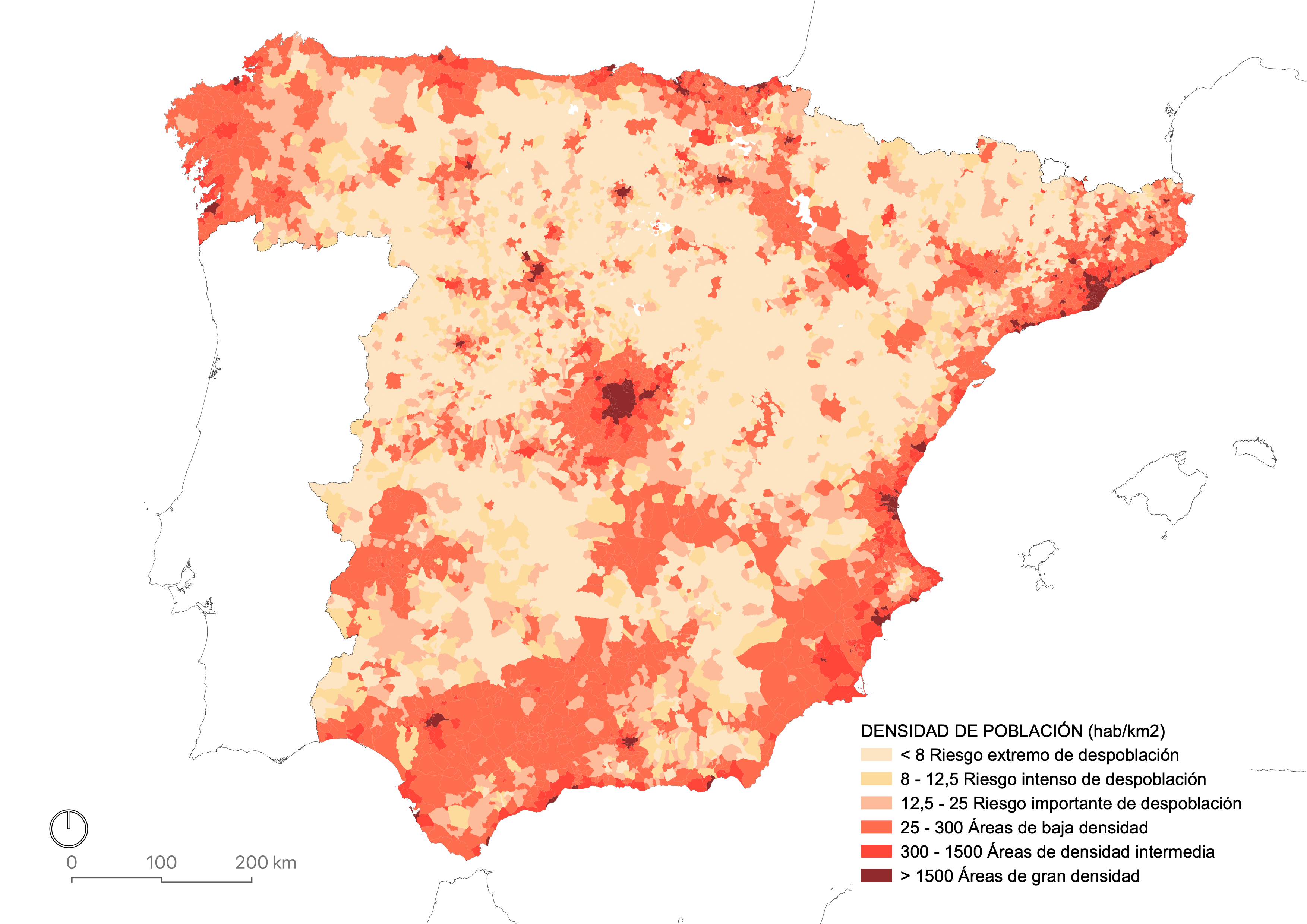 Con ese objetivo, se hace necesario trabajar tanto desde la densidad poblacional como desde la población en números absolutos. Así, la primera magnitud se torna clave a la hora de exponer la situación de la despoblación. Por ello, la densidad de población, que mide el número de personas que habitan en una determinada porción del territorio —teniendo en cuenta su superficie—, resulta imprescindible, ya que determina cómo viven las personas en el mismo: el hecho de tener una alta o, por el contrario, una baja densidad de población puede suponer que la ciudadanía no tenga la misma calidad de vida. Mientras que la segunda, entendida en términos generales como el dato que muestra la cantidad de gente que habita en cada núcleo, sirve para identificar aquellas ciudades, en sus distintos tamaños, donde se dispone de mayor cantidad de servicios.