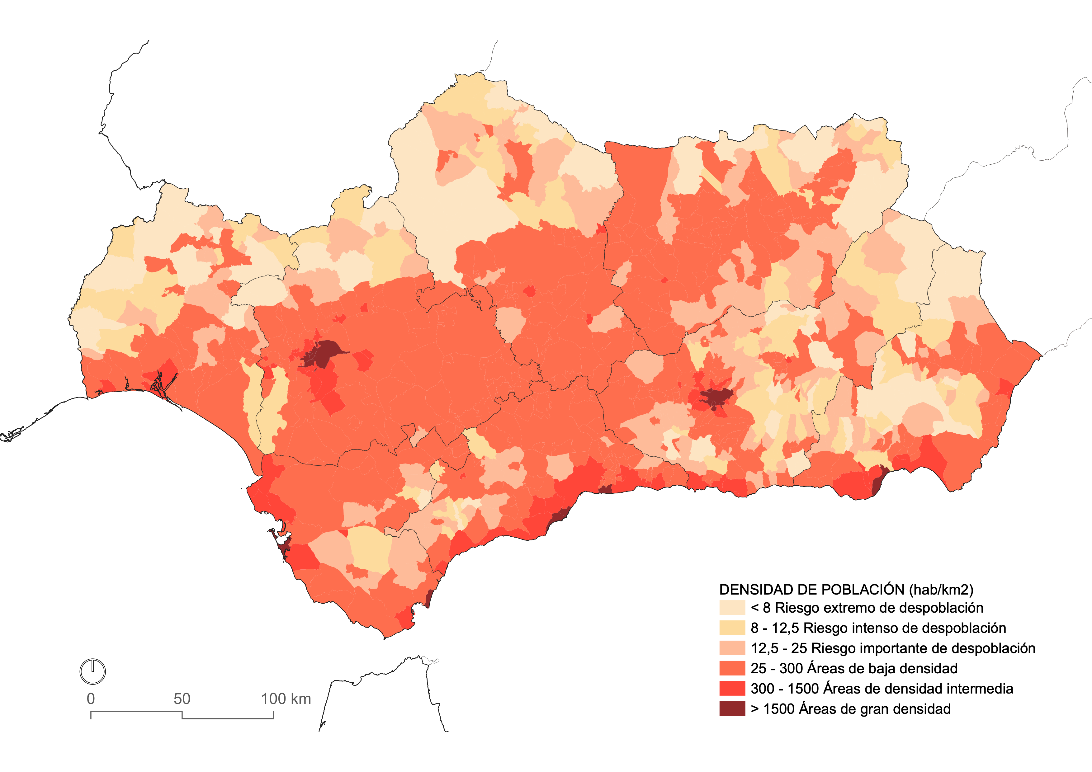 Observando todo el territorio peninsular de España, con esta misma división (Fig. 2), se evidencia un claro desequilibrio entre las diferentes zonas, siendo la densidad de población menor en las zonas del interior, que en la costa. Aplicado al caso de estudio, se observa que hay más de un tercio de la superficie de Andalucía en riesgo, suponiendo el riesgo extremo el 9,9%. En esta comunidad autónoma, la densidad de población media es de 97 hab/km2. Con el fin de reflejar estos datos a través de cartografías, se ha realizado un mapa de Andalucía de densidad de población teniendo en cuenta las delimitaciones administrativas de los municipios que la componen (Fig. 3). En ella, se ha empleado la categorización devenida de la fusión de lo propuesto por ONU-Hábitat (Sánchez, 2022) y el ELCDN (Gobierno de Navarra, 2023), previamente citado.
