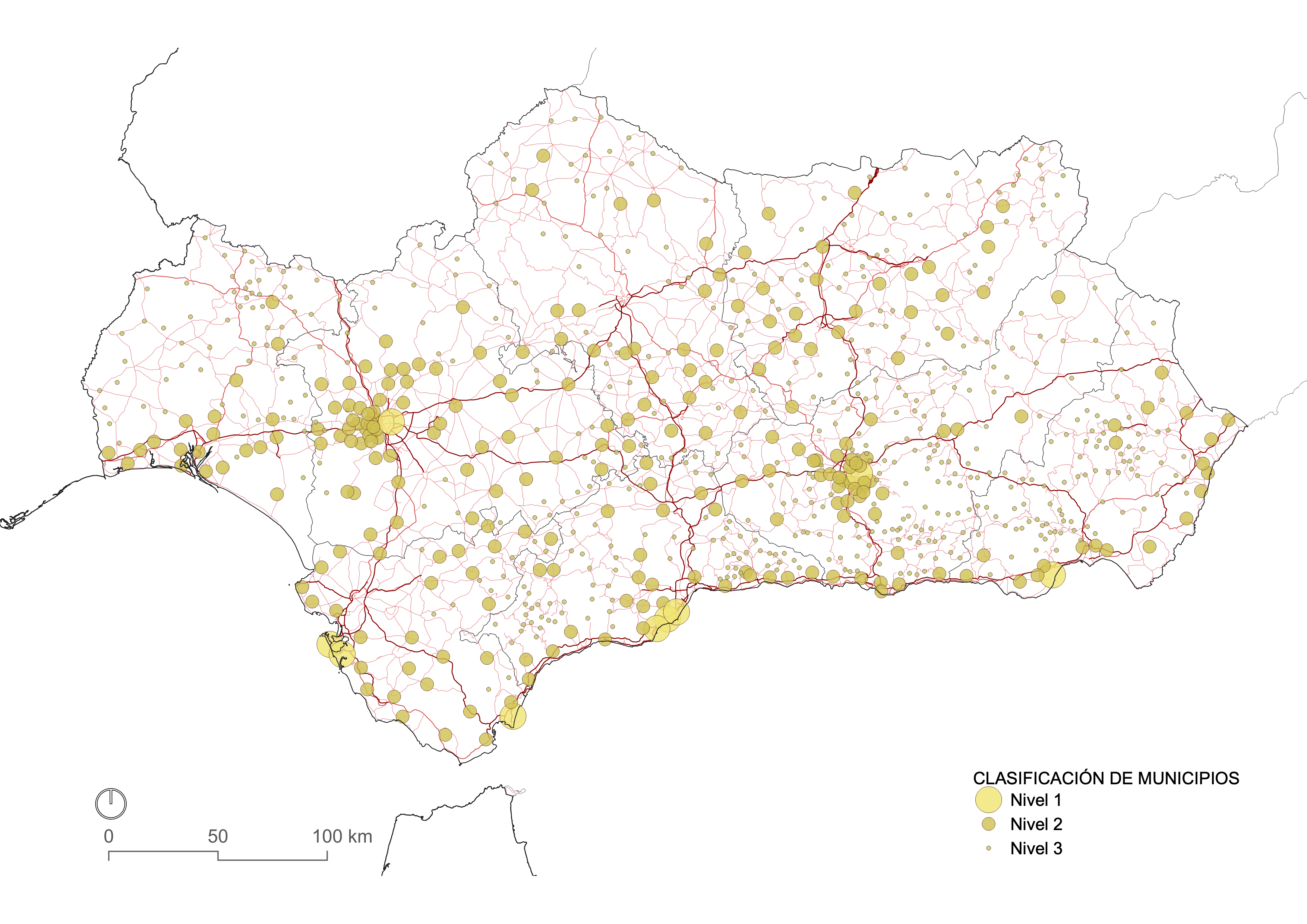 De esta imagen (Fig. 5), se evidencia cómo gran parte de las ciudades de Andalucía estarían clasificadas como nivel 2, llegando a ser consideradas de nivel 1 las principales capitales de provincia, así como algunas ciudades de costa. Paralelamente, resulta reseñable la existencia de una gran concentración de ciudades de segundo nivel en el eje del Guadalquivir.