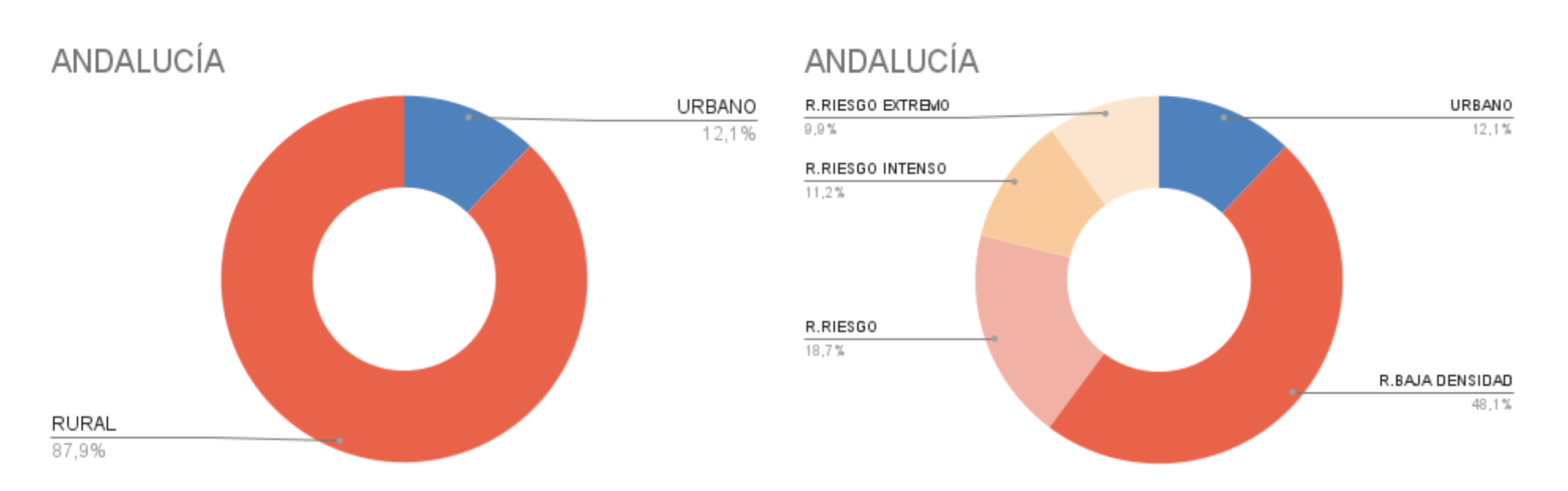 FIG. 1. Diagramas del porcentaje de municipios rurales —y de ellos cuántos están en riesgo de despoblación— y urbanos en Andalucía